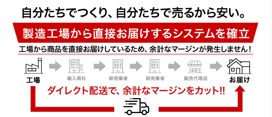 そうすることで余計なコストを省き、相場よりも遥かにリーズナブルな価格帯でお届けすることが可能となっています。