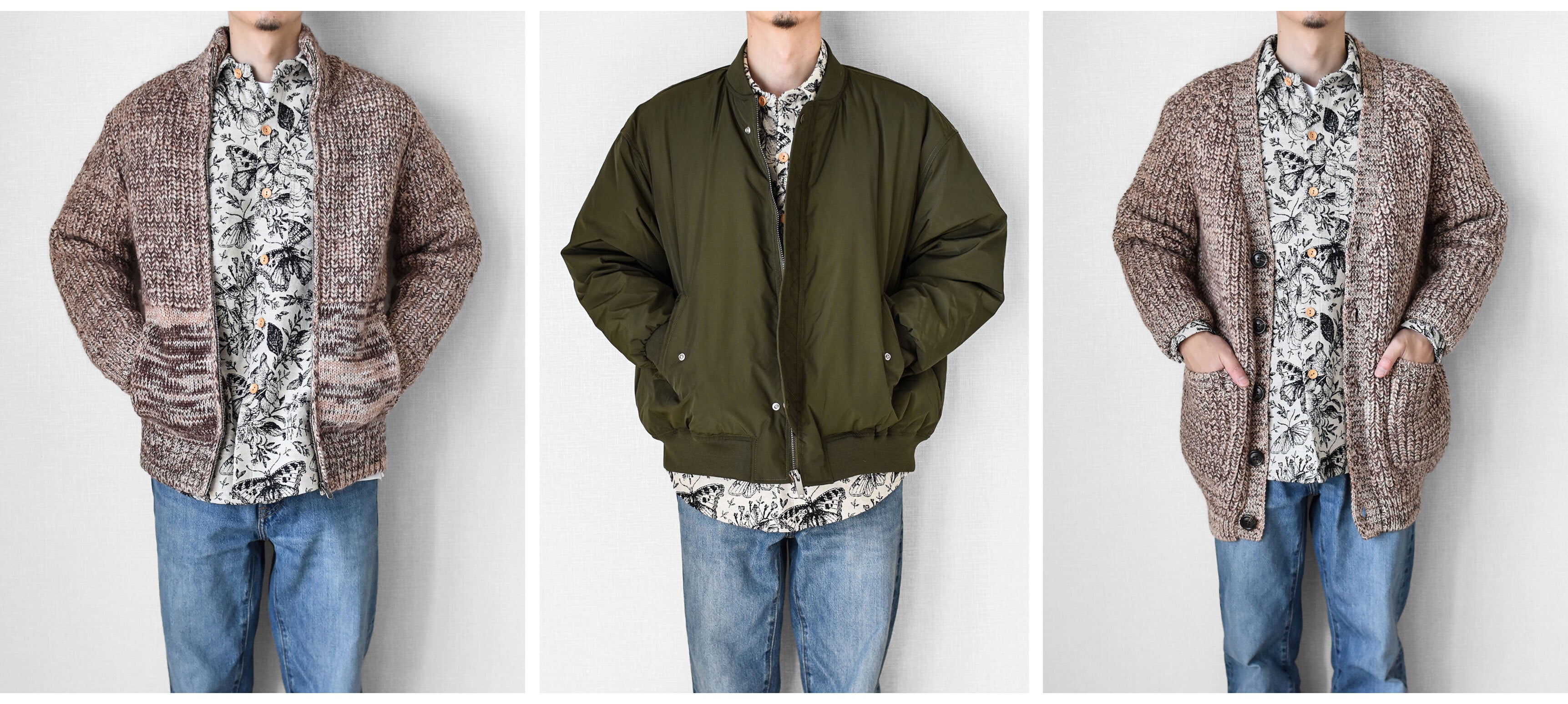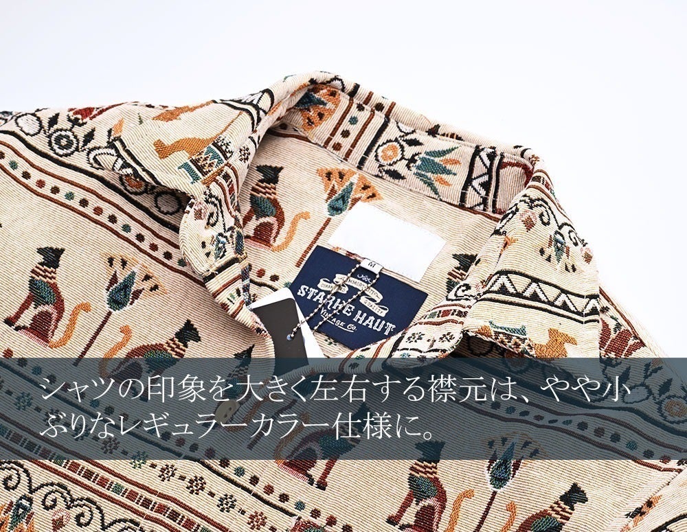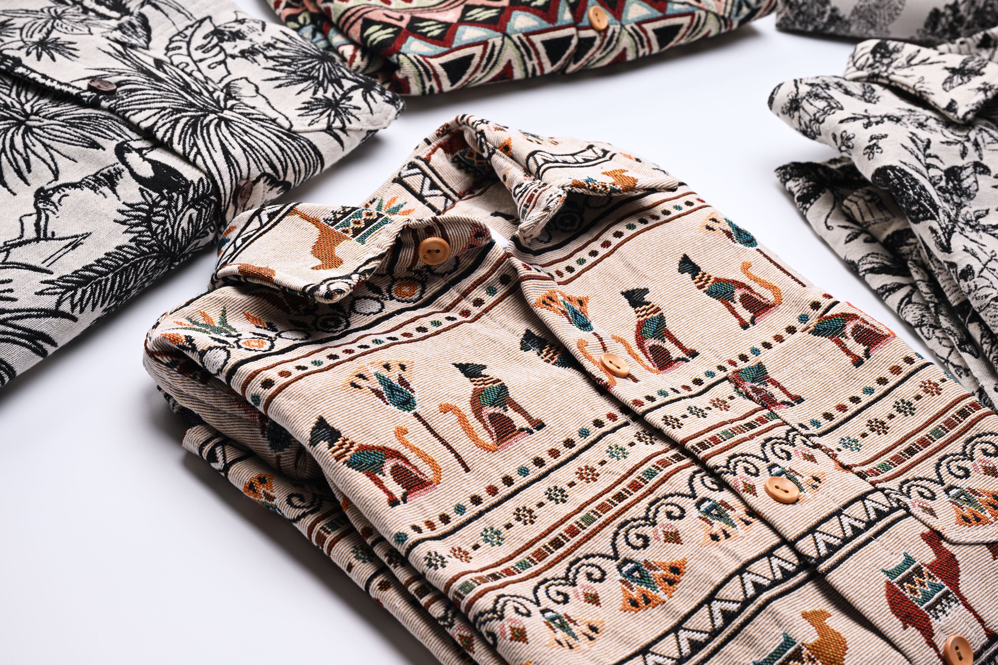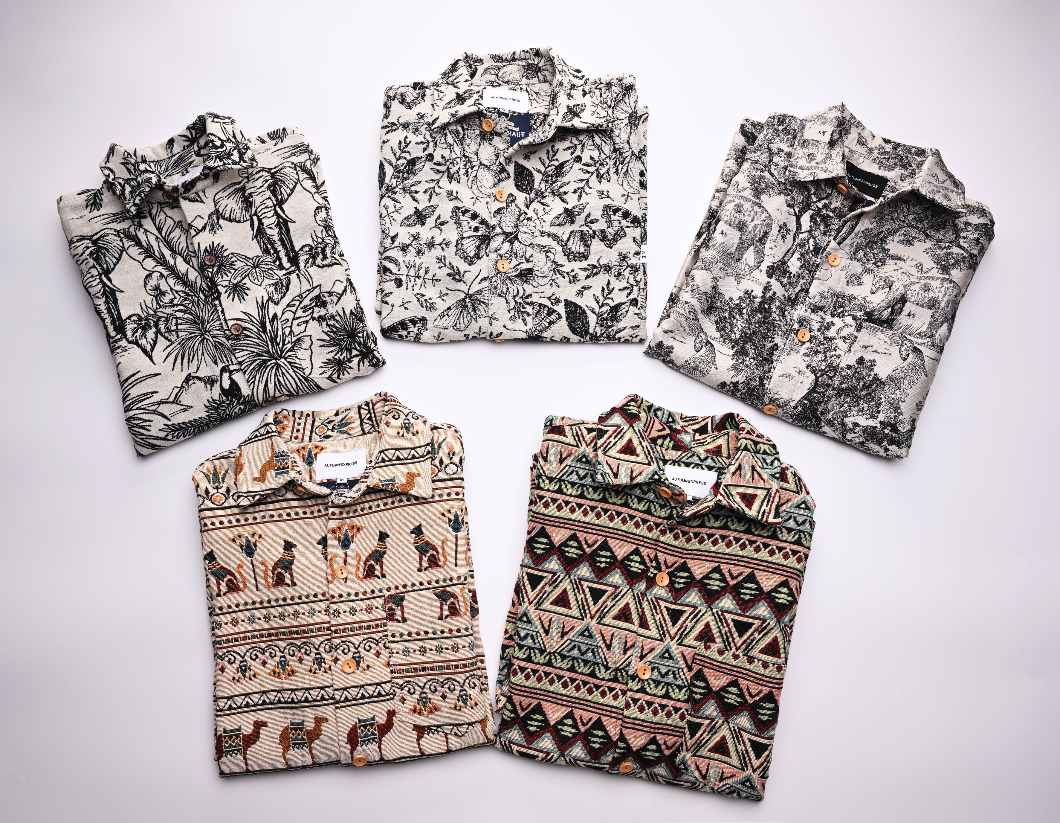 今回リリースする総柄ロングスリーブシャツ、ボタニカル柄、サバンナ柄、ジャングル柄、エスニック柄、エジプト柄と5つの柄で展開しています。