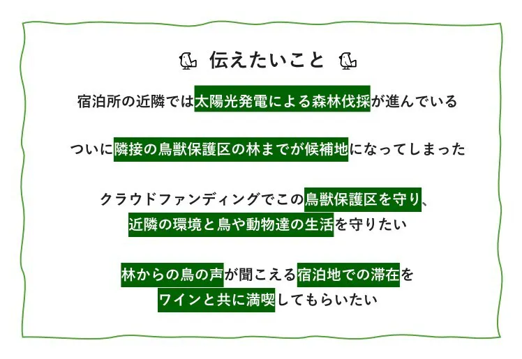 このプロジェクトで実現したいことは、宿泊所建設の決め手のひとつであった約4,600平米の鳥獣保護区の林を守る為、その土地を購入し、太陽光発電開発の為の森林伐採から保護することです。