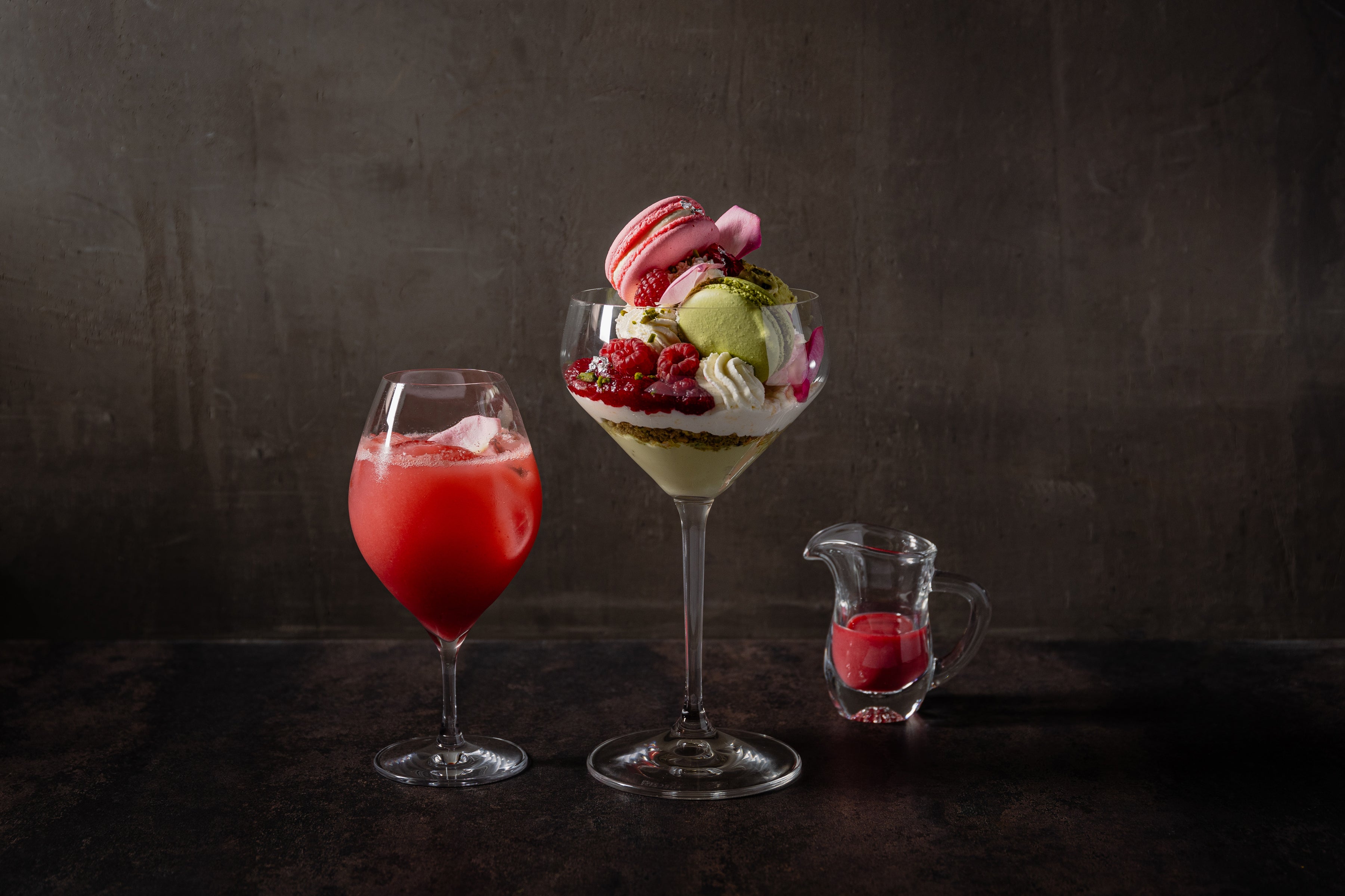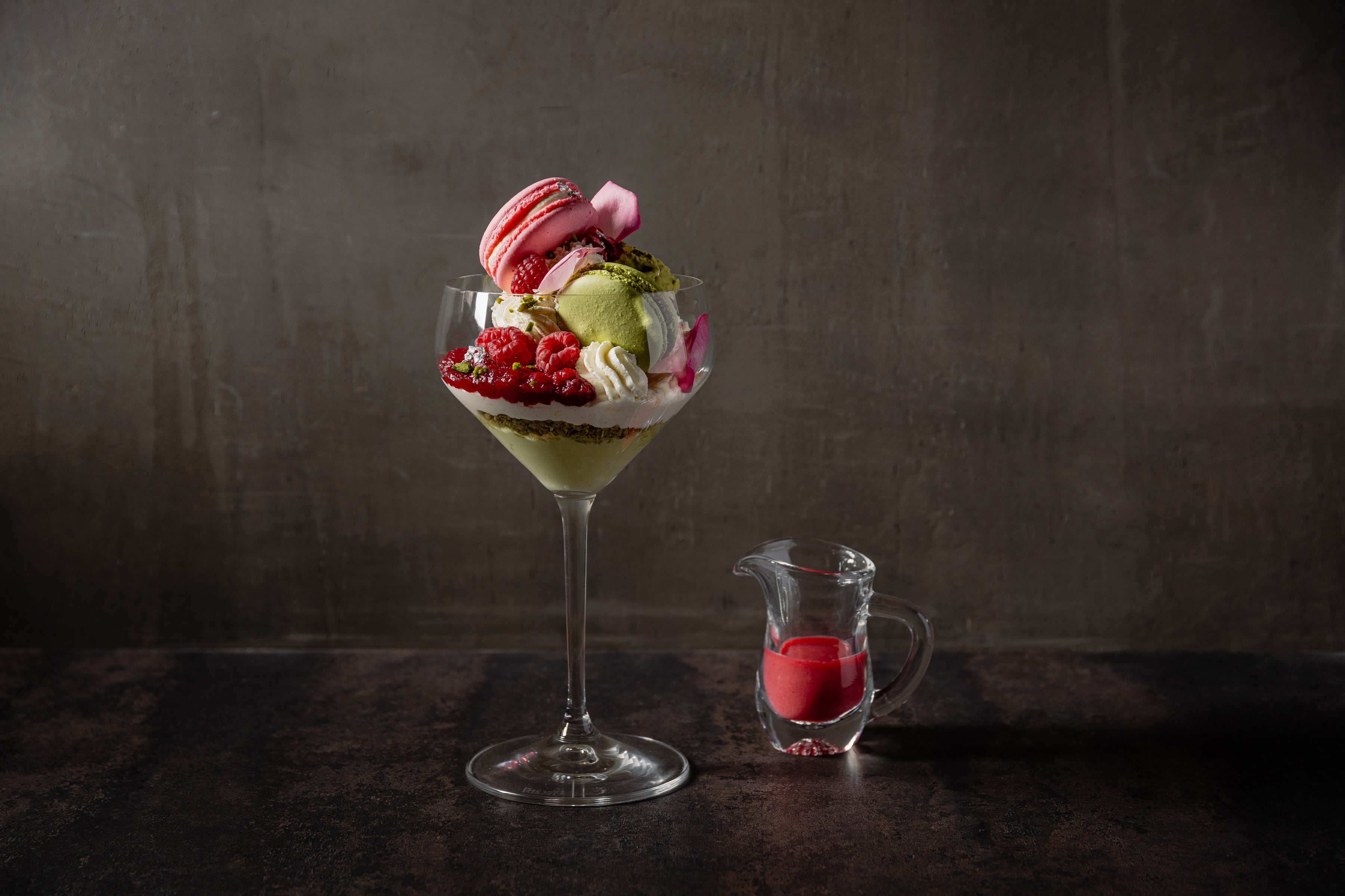 プロデューサー林のパティシエ人生の原点とも言える「マカロン」をこだわり抜いたレシピで仕上げ、ピスタチオ、フランボワーズの2種類をベースにアーモンド菓子であるマカロンのナッティな風味とピスタチオの濃厚な自家製アイスクリーム、フランボワーズとライチとローズを合わせたソースが美しく華やかな余韻を感じさせる芸術的なパフェ。ピスタチオとフランボワーズの美しいマリアージュをお楽しみください。