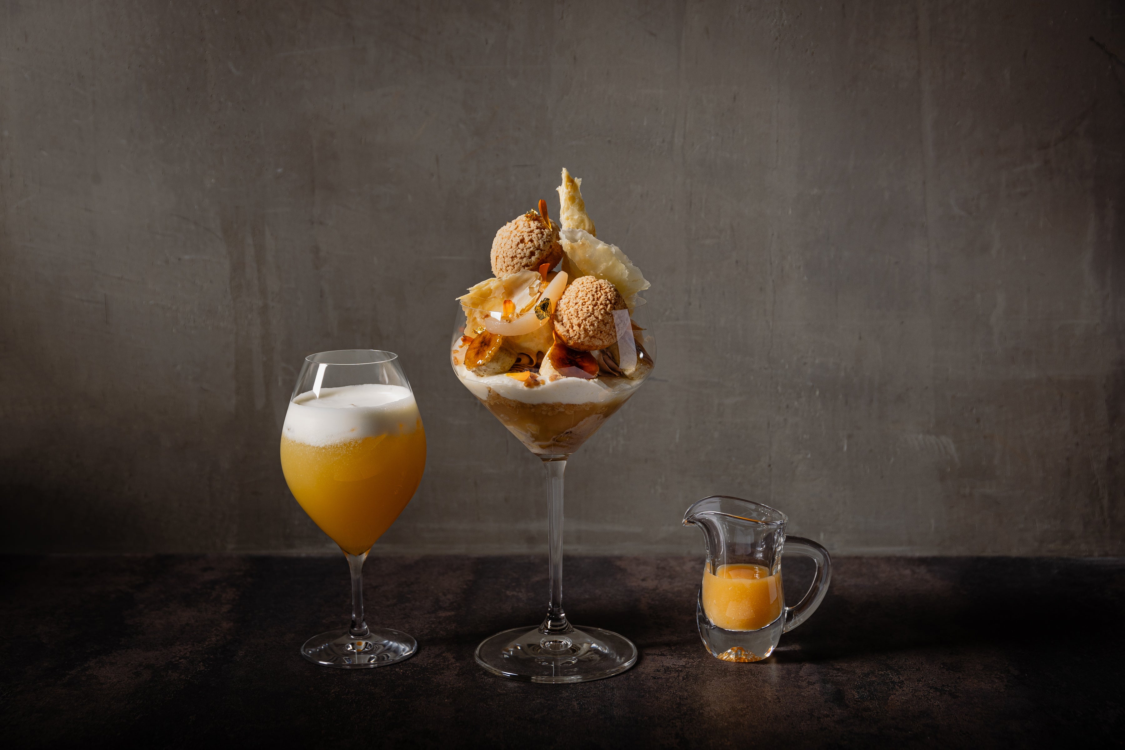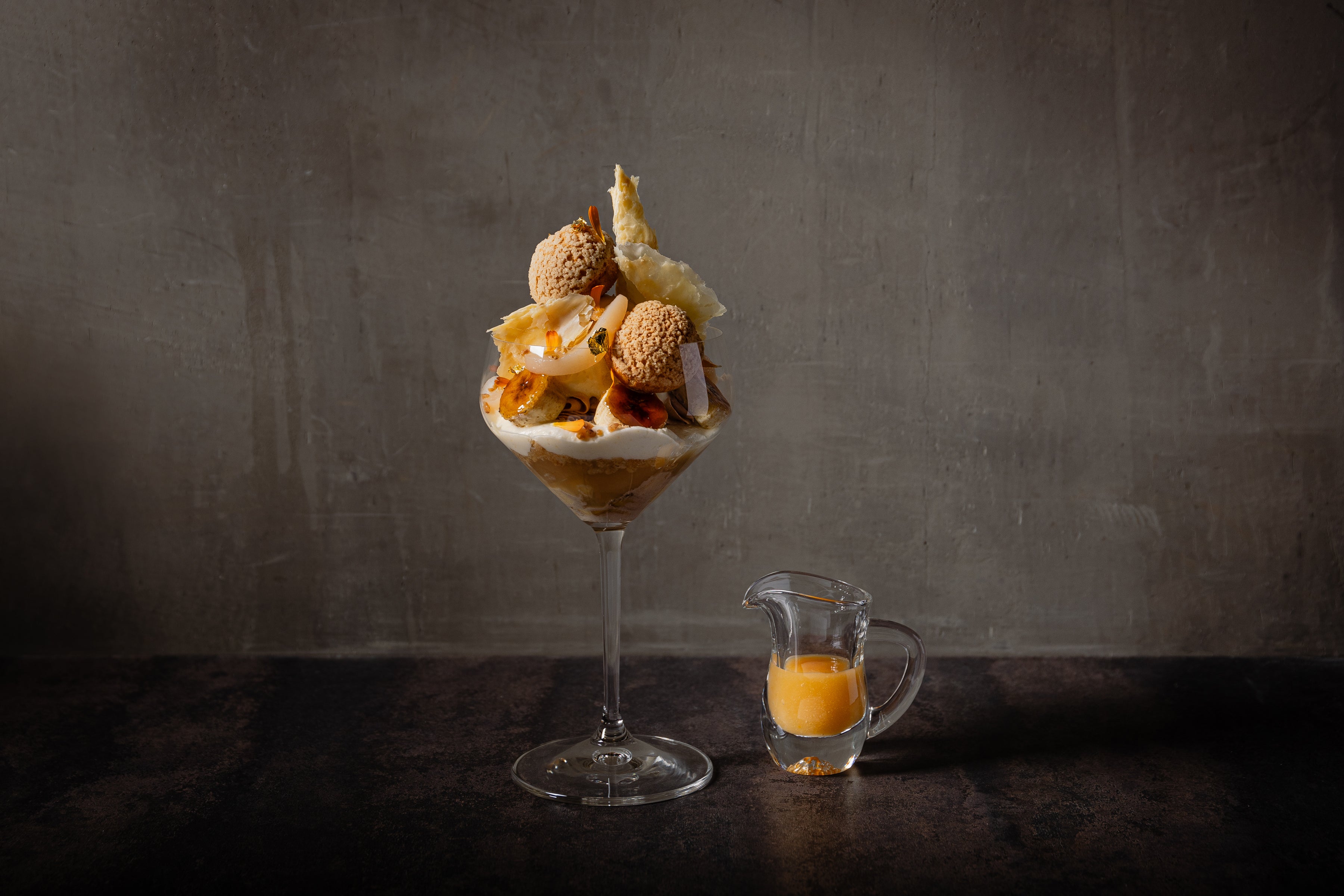 1840年ごろにパリのパティシエによって考案されたシュー生地とパイ生地にクリームを合わせた伝統的なフランス菓子「サントノーレ」にねっとりとしたバナナのパーツや生地、白桃のフレッシュで甘い果実感あるジュレとコンポートを合わせてパフェにリメイクしました。ザクザク、カリカリ、ふわふわと巡る食感にバナナと白桃のソースをかけて上品な香りにどこか馴染みある懐かしい味わいをお楽しみください。