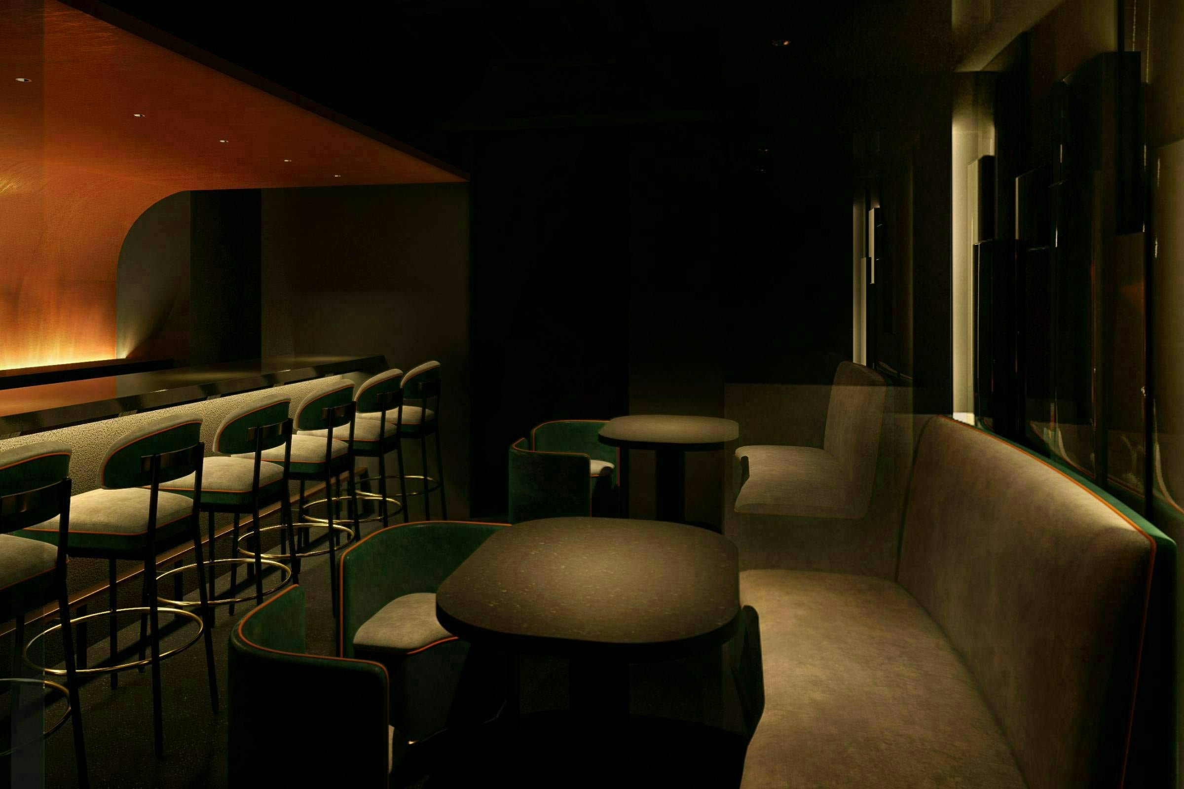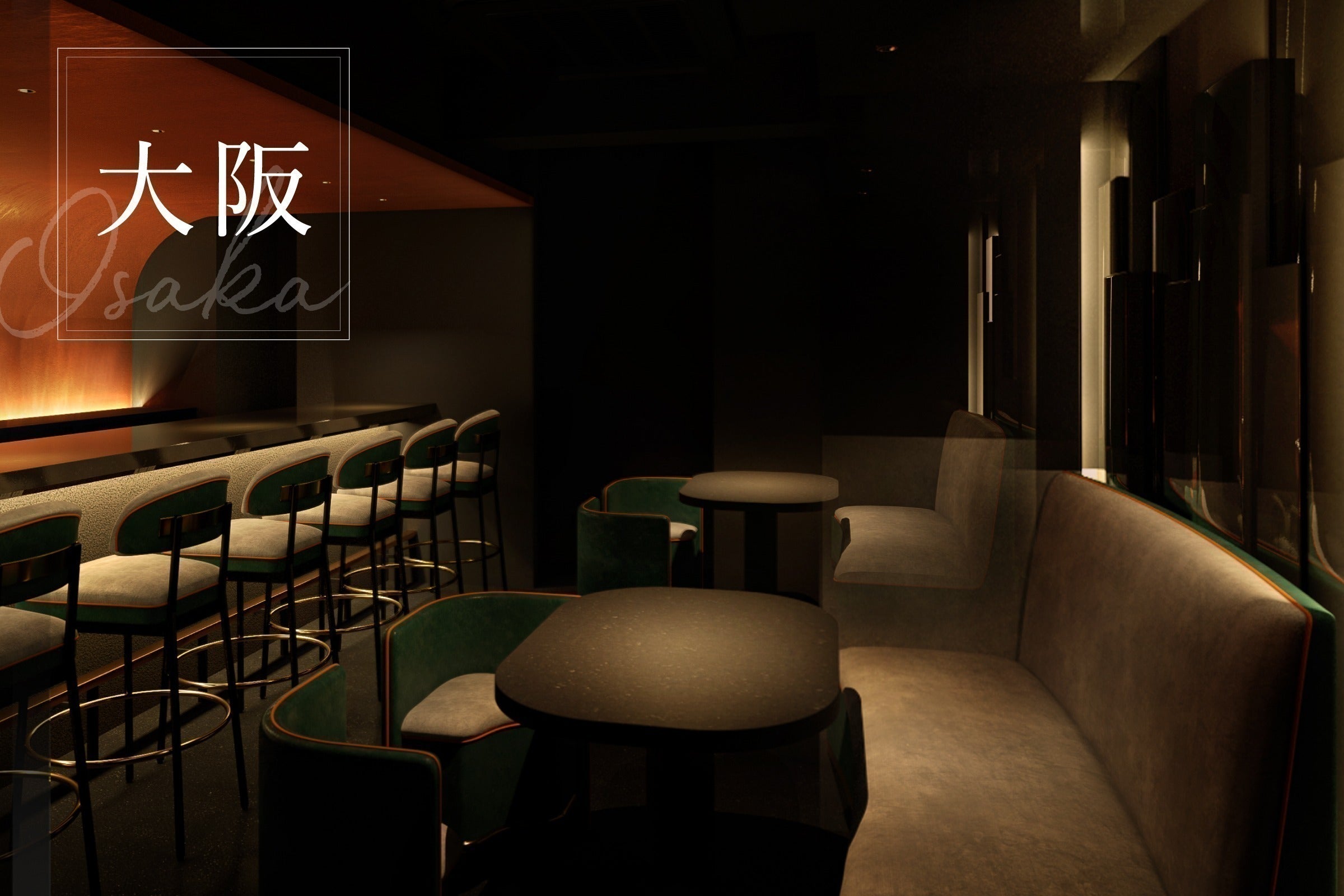 壁面には、大阪らしい繁華街に立ち並ぶビルや看板の活気、賑わいが広がっていく様を黒鏡面に仕上げたパネルを用いて、モノクロームの彫刻のように表現し、それぞれの天板に用いた左官仕上にはシンボルでもある銅の端材を混ぜ込むことでミニマルで上質な形にリメイクし空間を提供。