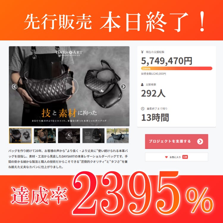 ※ ※ ※ ※ ※ ※ ※ ※ ※ ※ ※ ※ ※ ※ ※ ※ ※ ※ ※ ※ ※ ※ ※ ※ ※ ※ ※今回は【先着10名様限定:19%OFF 2個セット】 のリターンとなります。ご支援いただいた、リターン内容をお間違えないようにご注意ください。※ ※ ※ ※ ※ ※ ※ ※ ※ ※ ※ ※ ※ ※ ※ ※ ※ ※ ※ ※ ※ ※ ※ ※ ※ ※ ※【先着10名様限定:19%OFF 2個セット】タイプ:お好きなタイプ(キルティングorスタンダード)のご支援者様へこんにちは、革製品専門店DAYSARTです。完売した【先着10名様限定:19%OFF 2個セット】 の製作・検品が完了致しましたので本日、下記のリターンを発送させて頂きました。オプションを同時にご注文の方は同梱しております。配送はヤマト運輸 宅配便にて発送が完了しております。※到着目安は7/27~7/29となっております。※システム上、追跡番号を個別にお伝え出来ない為ご希望の方はお問い合わせ頂ければお伝えさせて頂きます。商品は全て検品させて頂きましたが万一お気づきの点ございましたらご連絡ください。今後も活動報告を含め、当製品の情報をシェアさせて頂きたく思いますので、一緒に本プロジェクトを盛り上げていただけたら嬉しいです!https://camp-fire.jp/projects/view/754513今後とも応援よろしくお願いいたします。プロジェクトチーム一同