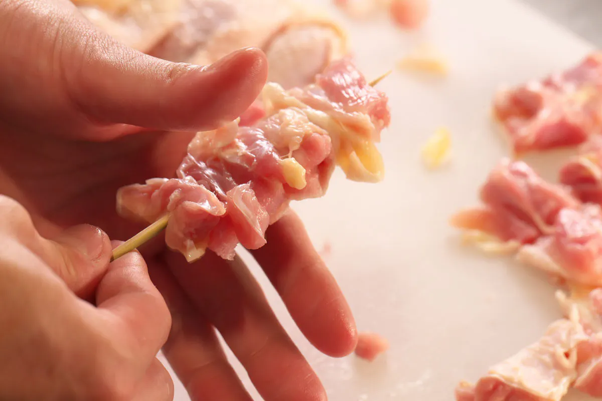 お店で丸鶏を捌いて串打ちいたします。