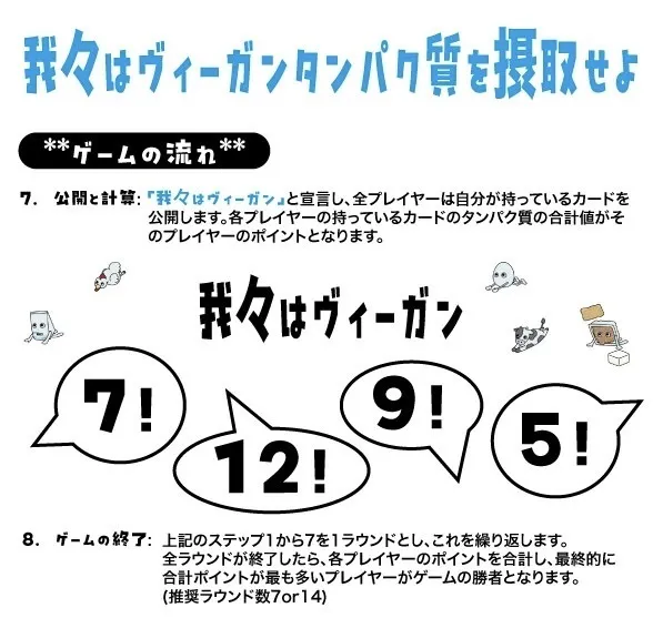 - 次のラウンドで「我はヴィーガン、タンパク質が足りない」と宣言する際のカード交換が2回追加されます。