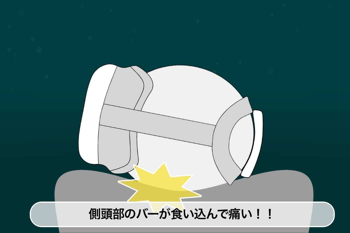 とはいえ、重量が500gを超え、しかも前方に出っ張っているデバイスを頭部に付けて寝るわけですから、安定がいいわけがありません。