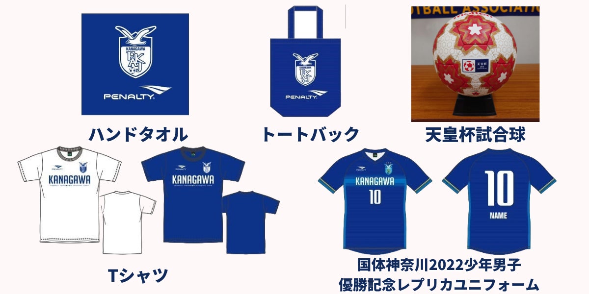 クラファンオリジナルの神奈川県サッカー協会(FAKJ)のハンドタオル、トートバッグ、Tシャツのリターンを用意しています。日常で使えるモノです。また2022国体(優勝)レプリカユニフォームや天皇杯試合球もあります。