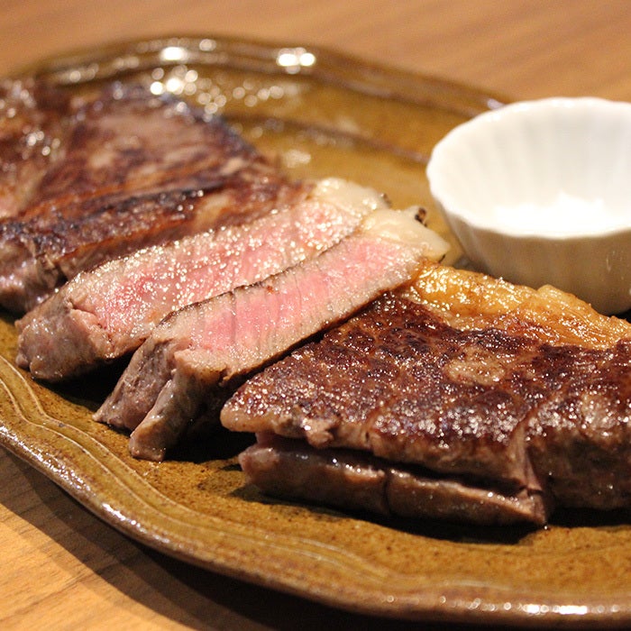 〖黒毛和牛の経産牛。赤身サーロインステーキ〗岩塩とワサビと共に。
