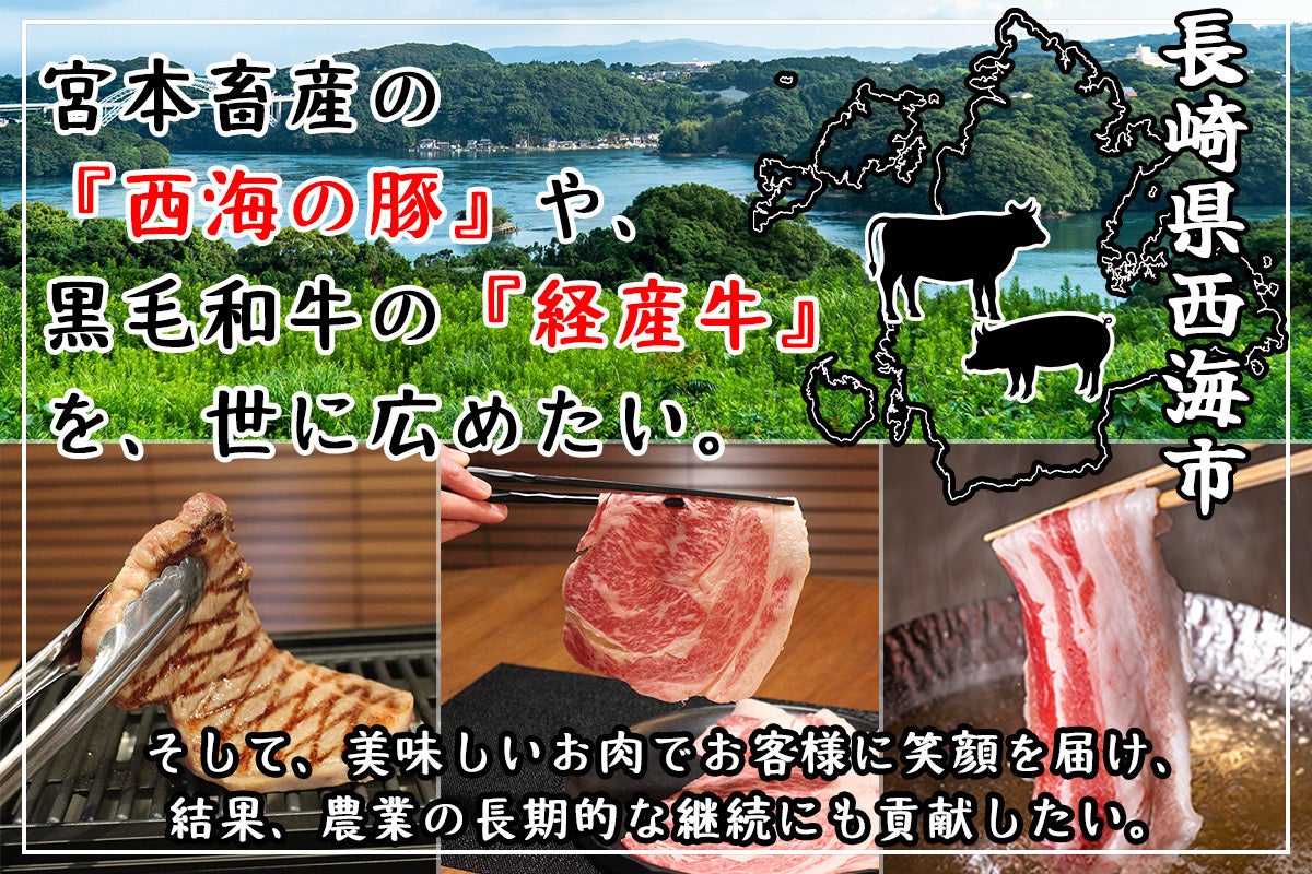 『宮本畜産』の美味しいお肉、【西海の豚】や 、【黒毛和牛の経産牛】を、多くの方に知っていただきたいと思っております。