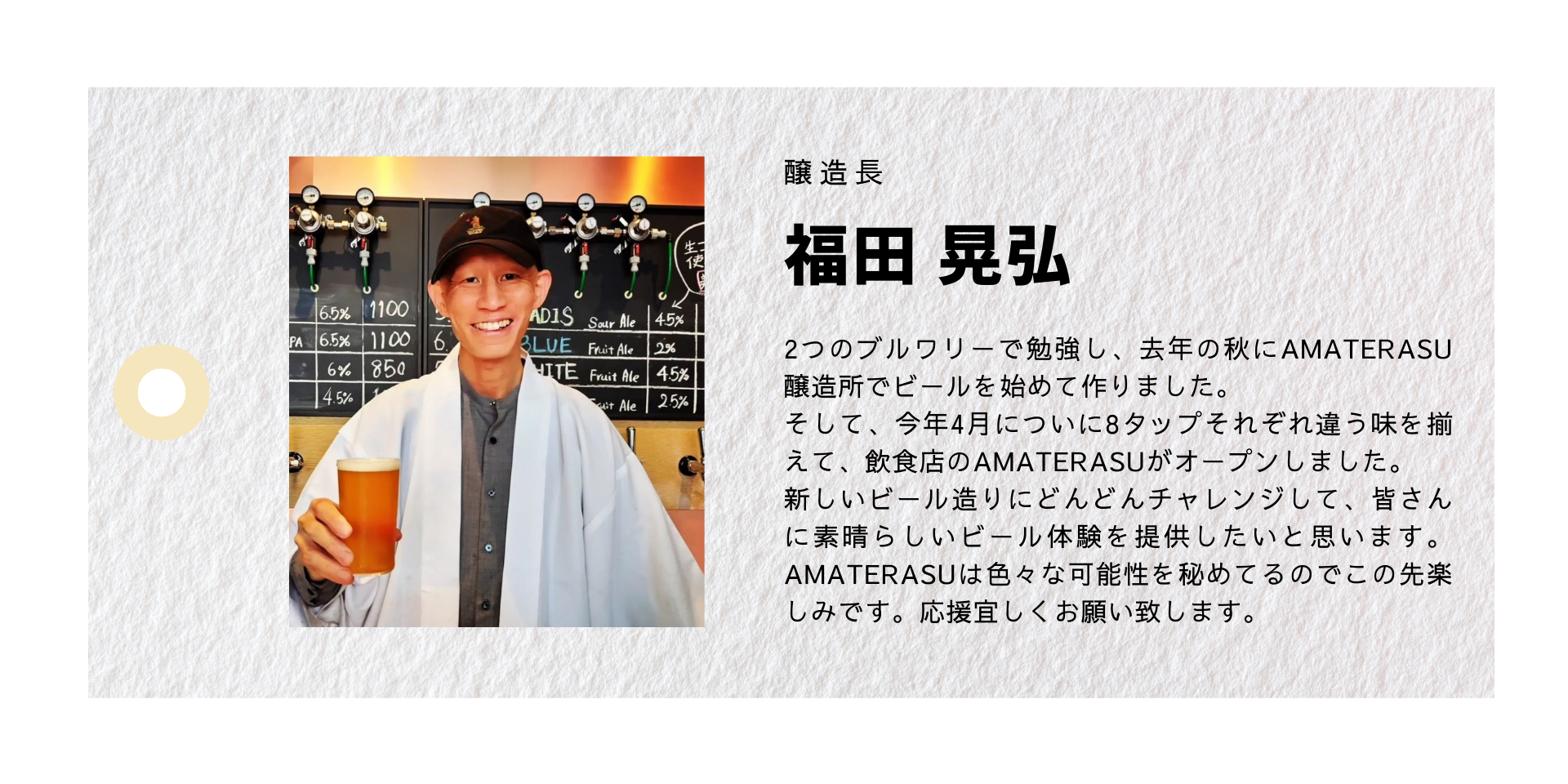 With Amateras beer, we will provide connections between people worldwide, and deliver a new cultural creation.Life is a Live . Just live it.