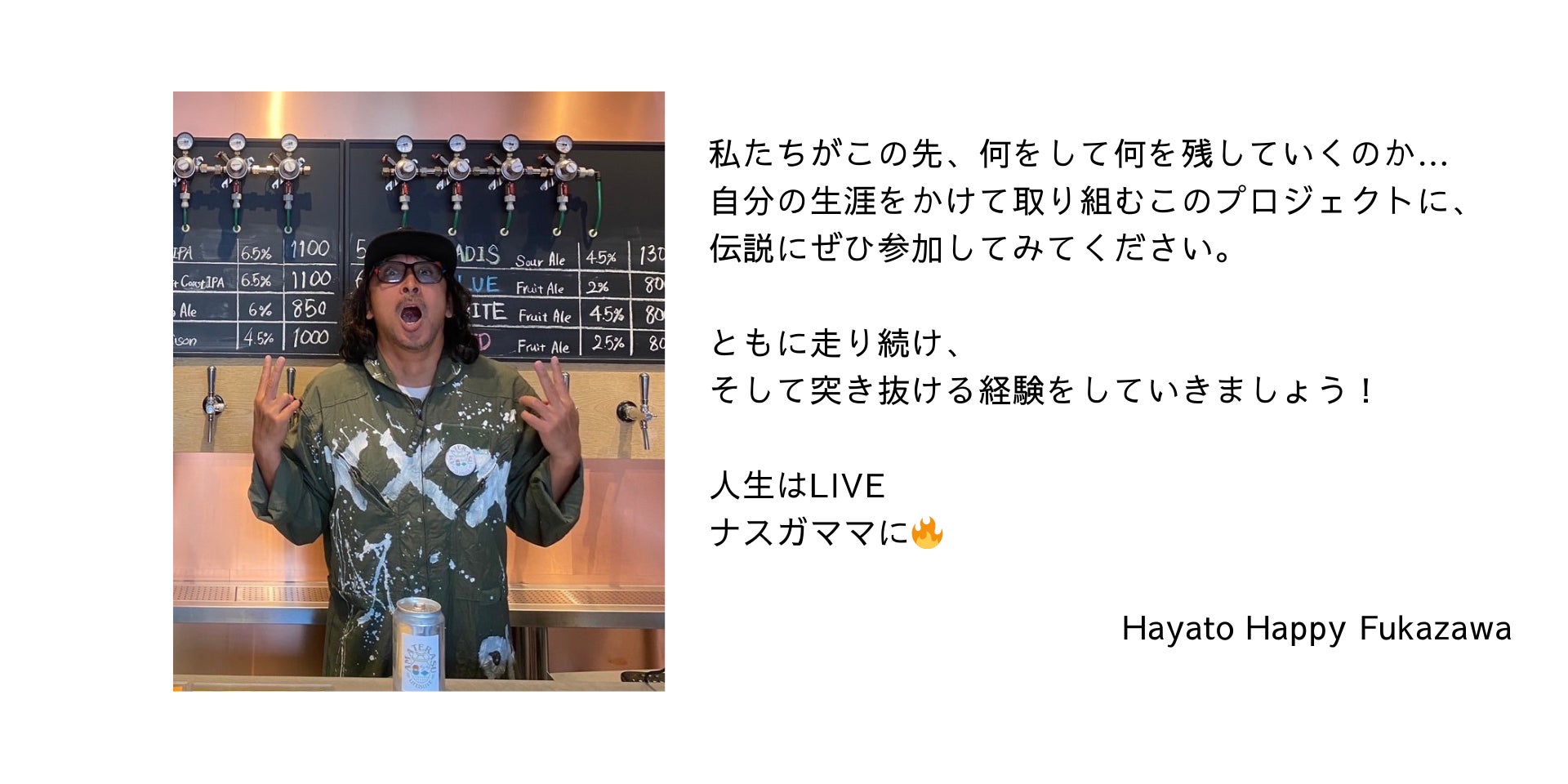 With Amateras beer, we will provide connections between people worldwide, and deliver a new cultural creation.Life is a Live . Just live it.