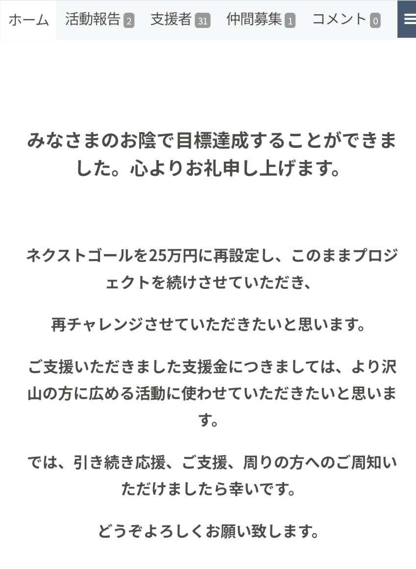 みなさまのお陰で、最初の目標金額達成をさせていただいておりましたが、ネクストゴールと言う新たな挑戦が出来ると知り、本日目標金額を再設定し、このままプロジェクトを続け 再チャレンジさせていただくことにしました。