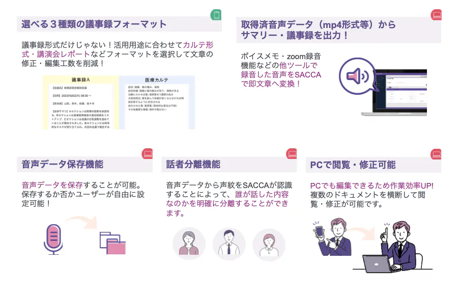 ・多数の出力フォーマットに対応しシチュエーションに合わせた議事録作成。