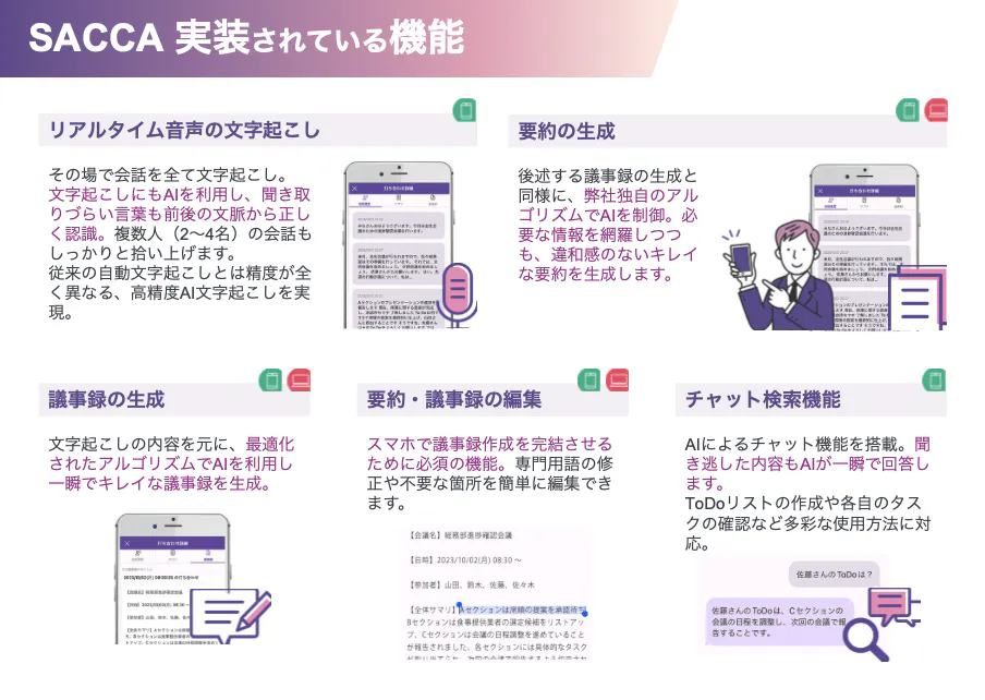 高精度なリアルタイム音声の文字起こし、リアルタイム要約 : 会話をその場で文字に起こし、音声データから直接議事録への変換が可能です。これには、SACCAアプリ独自のアルゴリズムでAIを制御し、文脈を理解して正確な変換を行うという技術が活用されています。