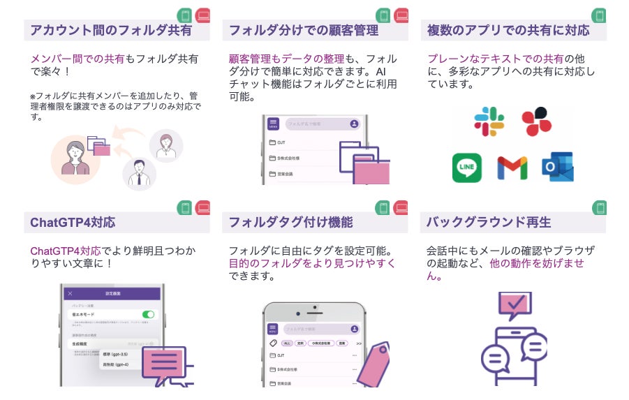 多機能な顧客管理と検索機能: 会話をフォルダ分けして顧客ごとに管理できる機能が備わっており、過去のデータの検索や整理も簡単に行えます。AIチャット機能を用いて、記録された内容に基づいて情報検索が可能です。