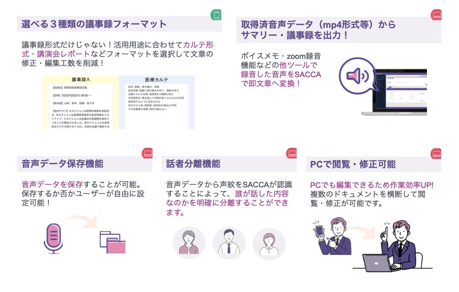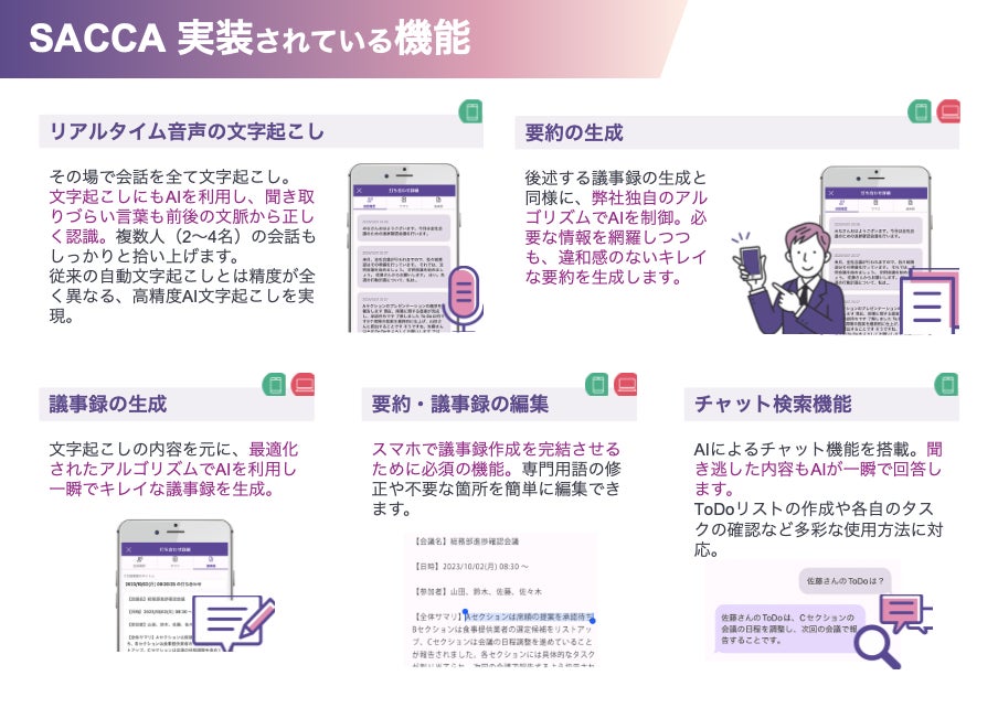 高精度なリアルタイム音声の文字起こし、リアルタイム要約 : 会話をその場で文字に起こし、音声データから直接議事録への変換が可能です。これには、SACCAアプリ独自のアルゴリズムでAIを制御し、文脈を理解して正確な変換を行うという技術が活用されています。