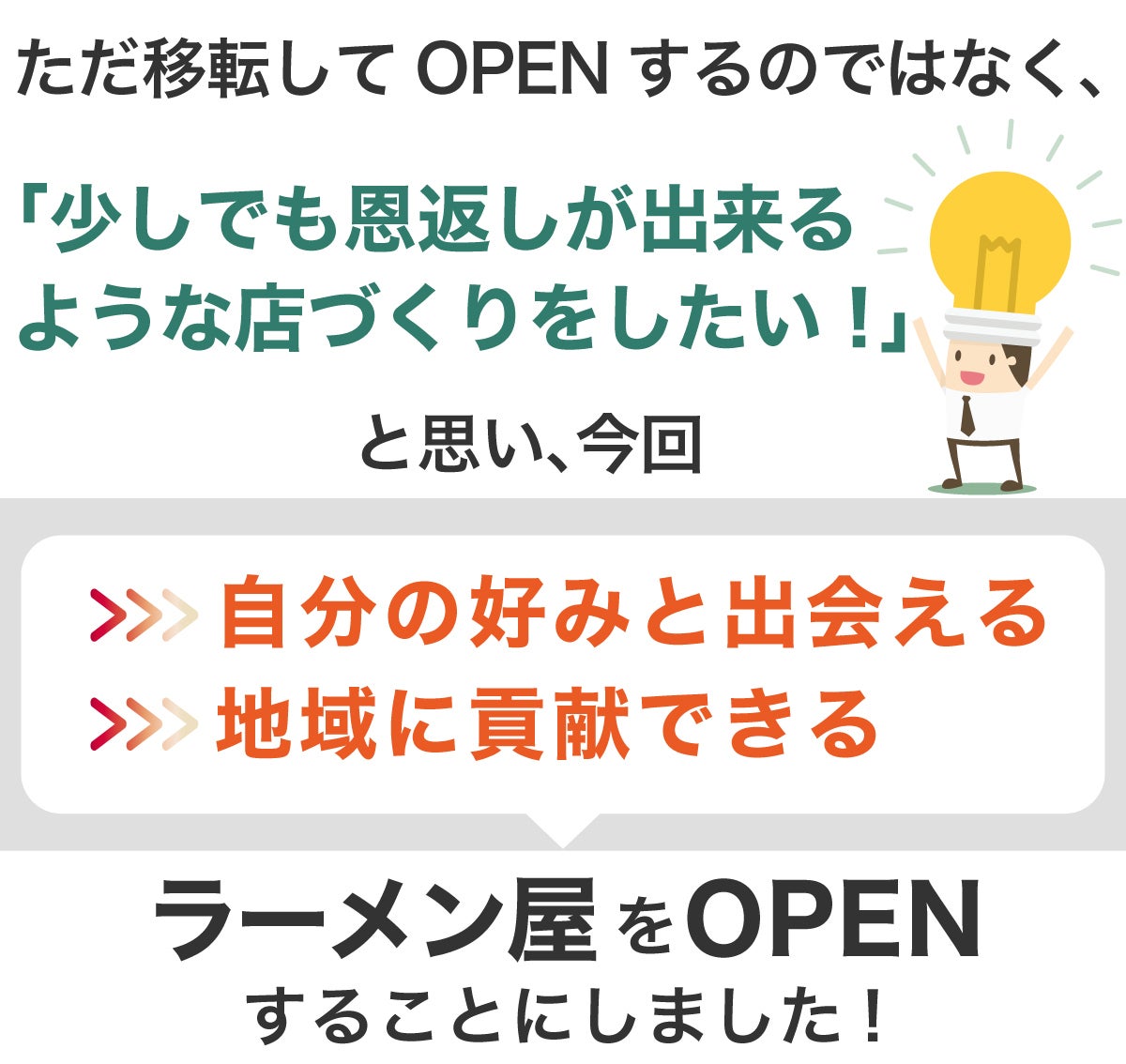 地域貢献をメインとした本格ラーメン店『めん処 直蔵』をオープンしたいです!