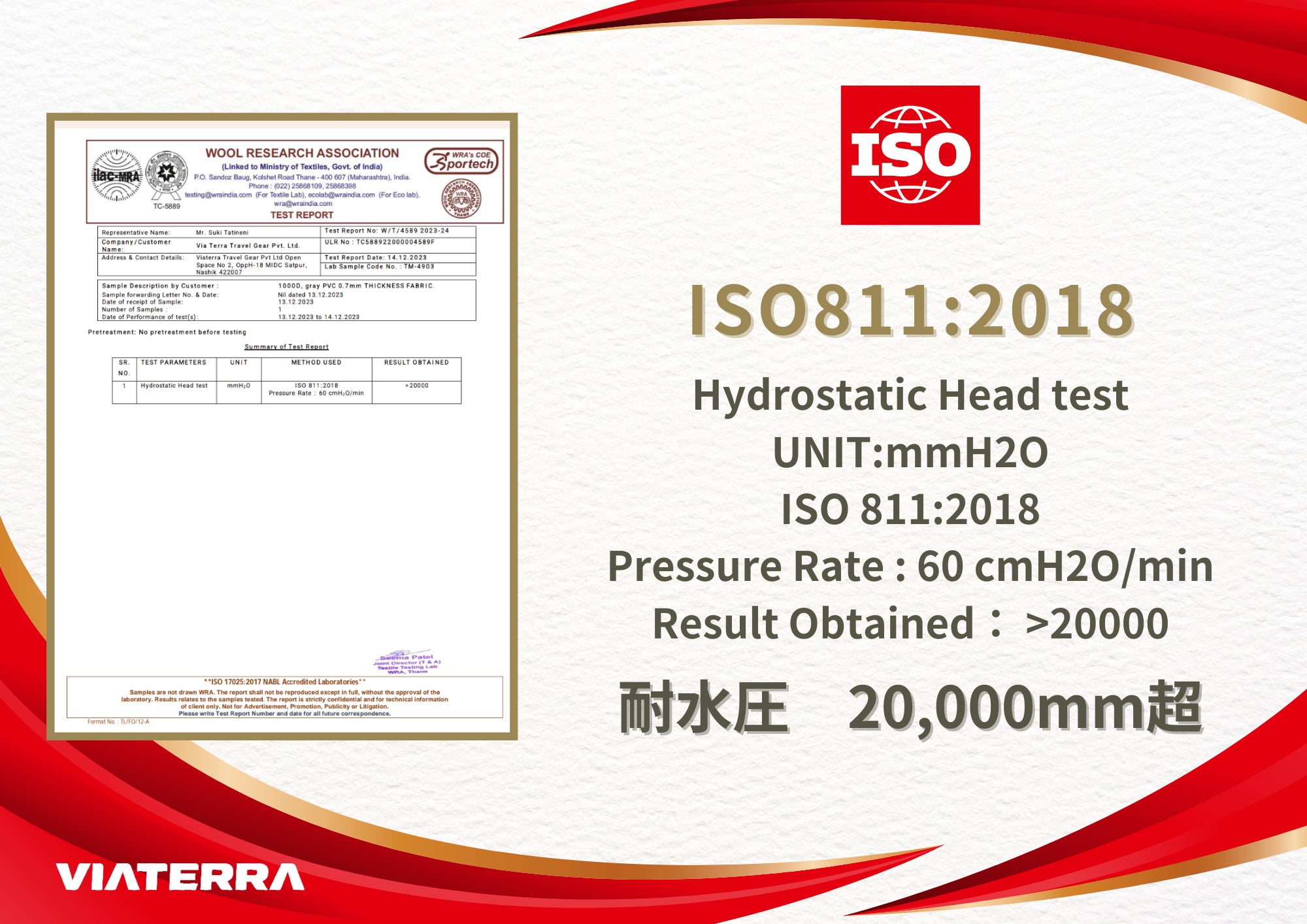 圧力率60 cmH2O/minで厳密にテストされ、20,000 mmH2Oを超える防水性を誇る生地であることが認められました。