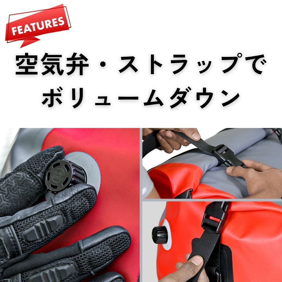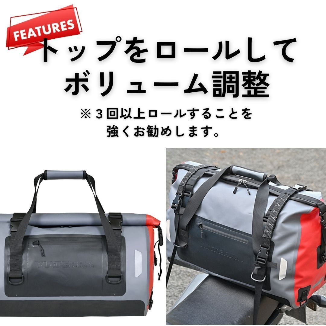 ・防水性能を高める為、トップの開口部のファスナーは中央で閉じ、3回以上のロールをして留めてお使いください。