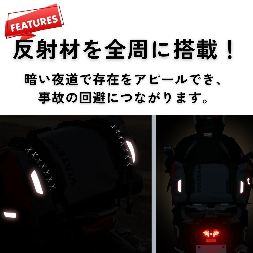 暗い夜道で光に当たると反射する反射材を、バッグの周囲全てに搭載しています。他の車のドライバーや自転車から見つけられやすくなり、事故の回避につながります。
