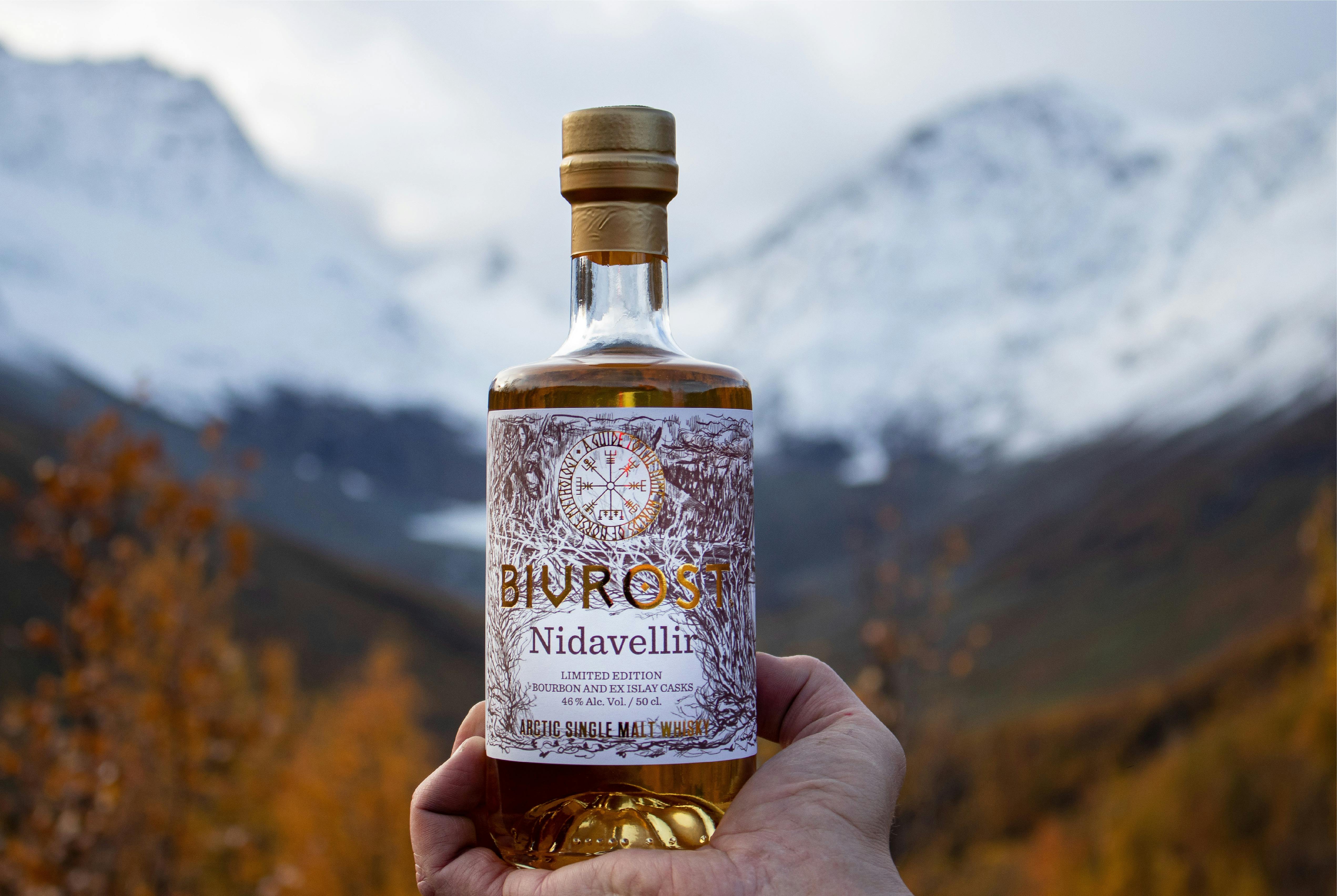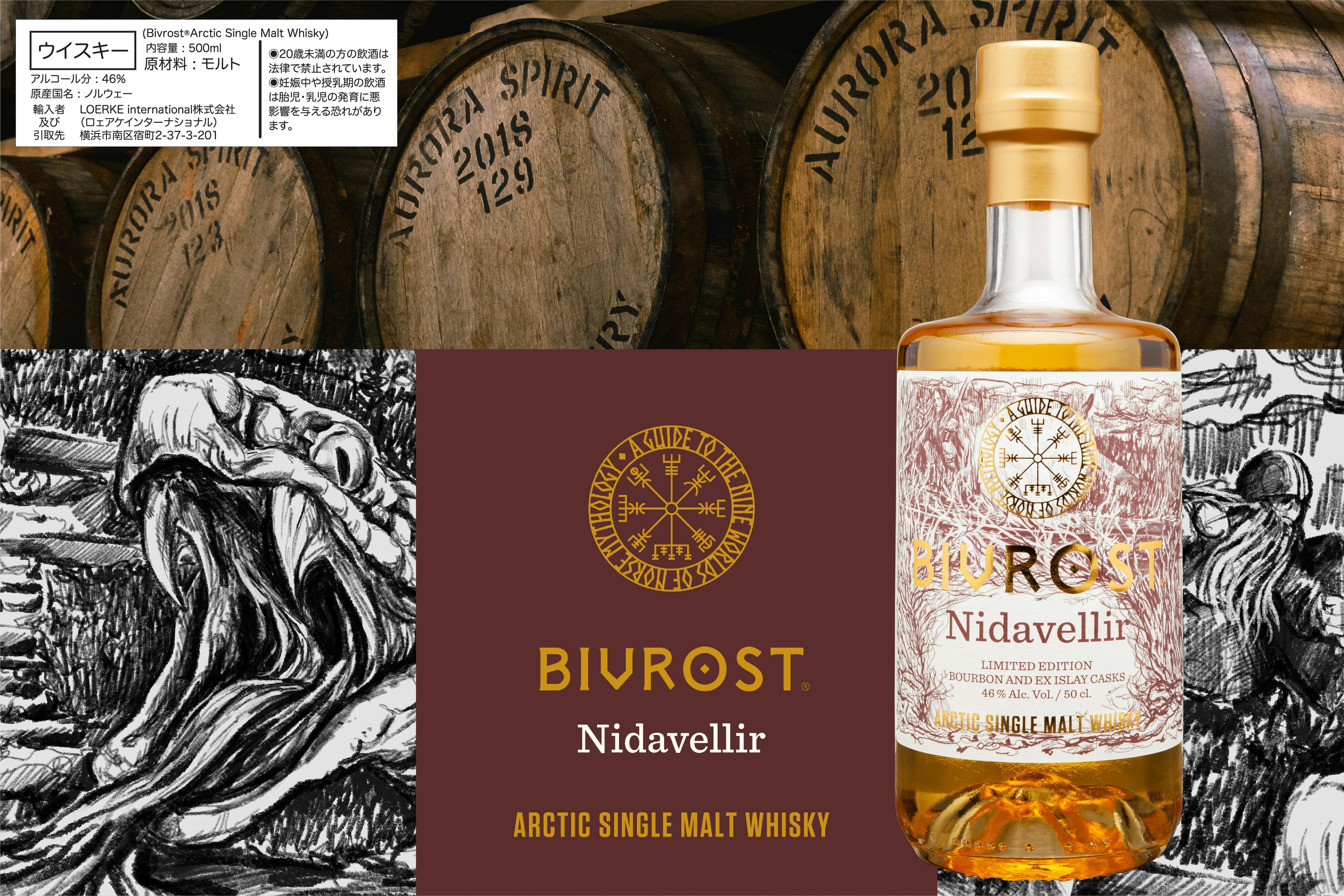 北緯69°のノルウェーの雄大なリンゲンアルプスの麓にあるオーロラの輝きの下で手作りされる、オーロラ・スピリット蒸溜所の「北欧神話の9つの世界」シリーズの2番目のウイスキーであるBIVROST ニザヴェッリル 北極シングルモルトウイスキー。