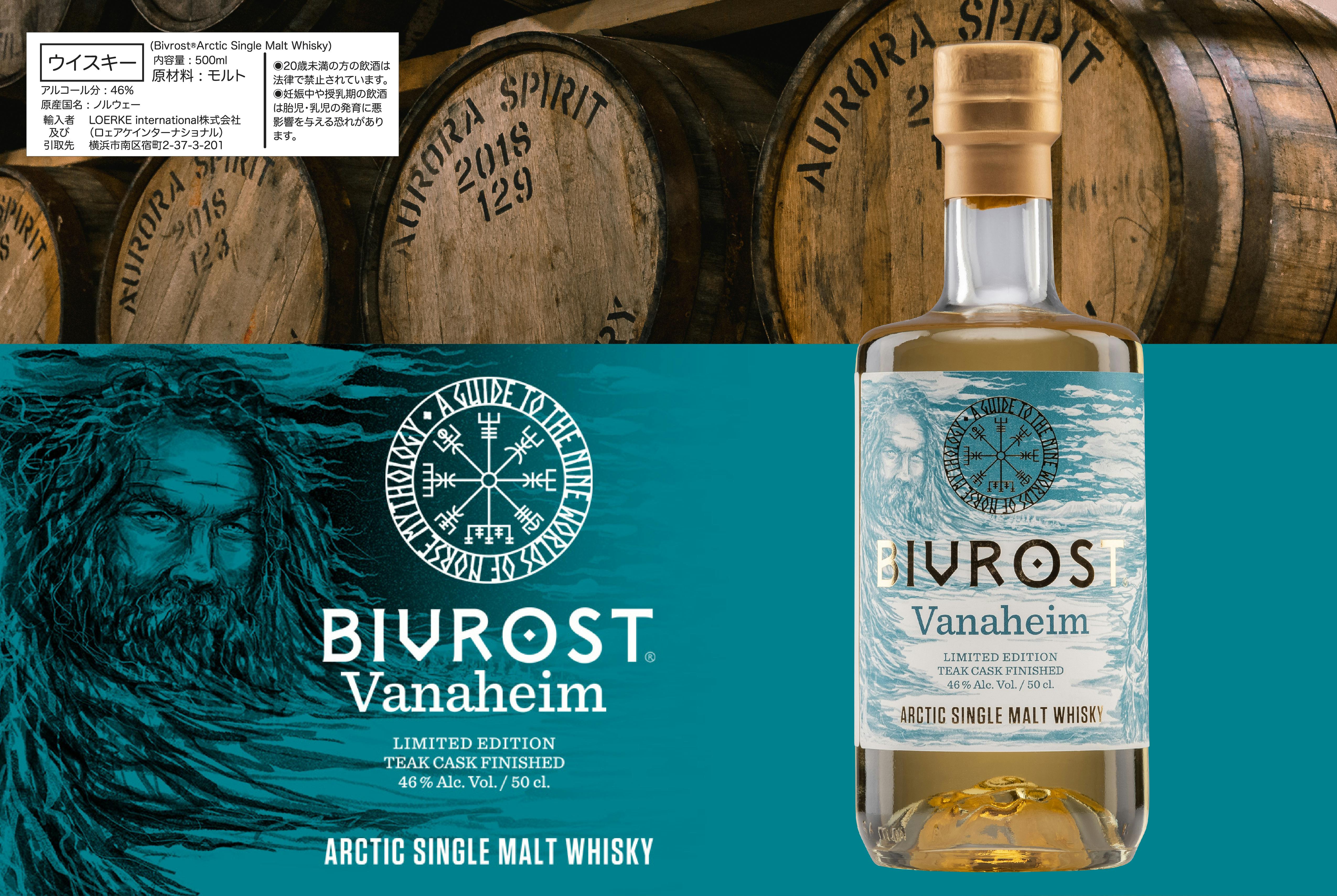 北緯69°のノルウェーの雄大なリンゲンアルプスの麓にあるオーロラの輝きの下で手作りされる、オーロラ・スピリット蒸溜所の「北欧神話の9つの世界」シリーズの7番目のウイスキーであるBIVROST ヴァナハイム 北極シングルモルトウイスキー。