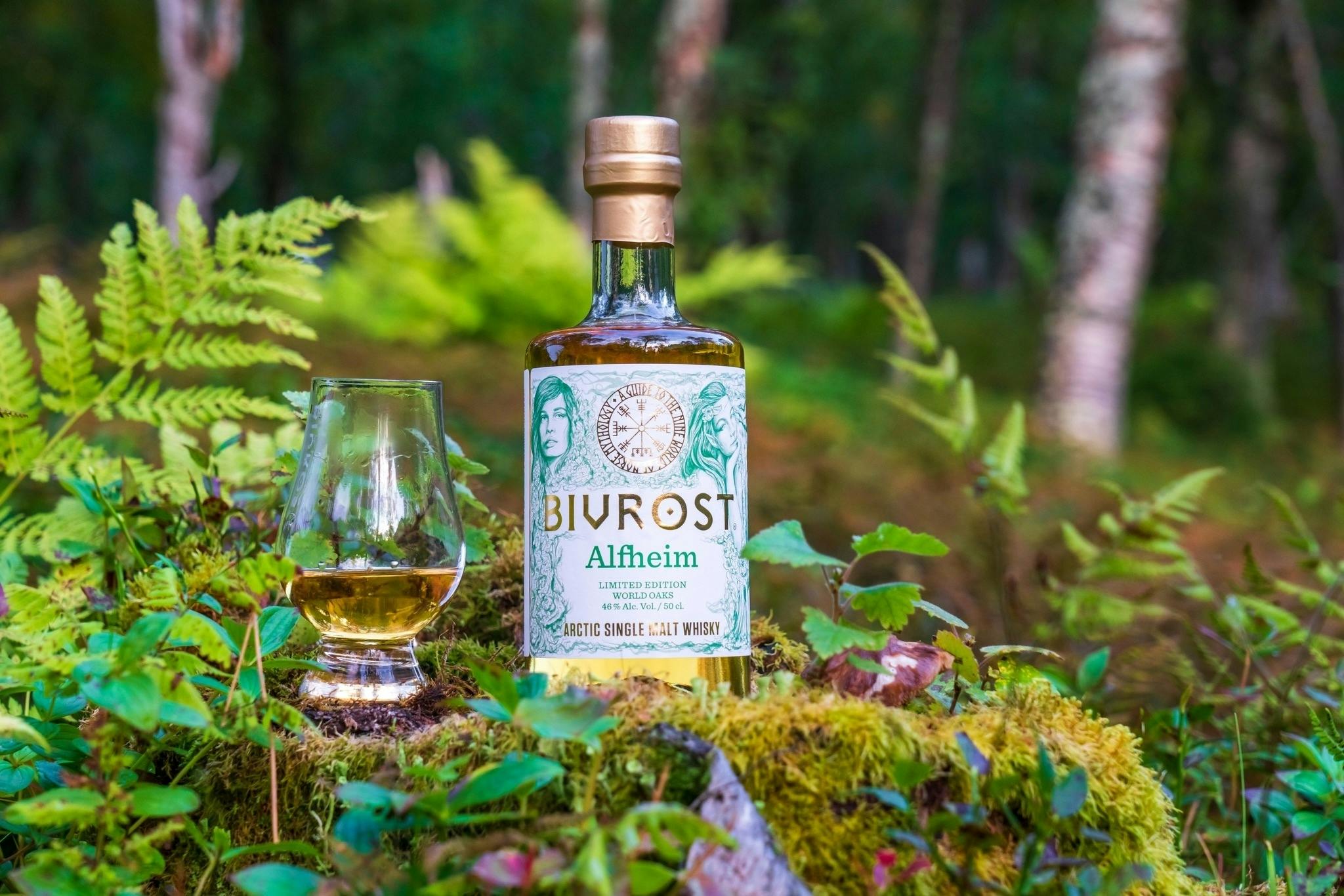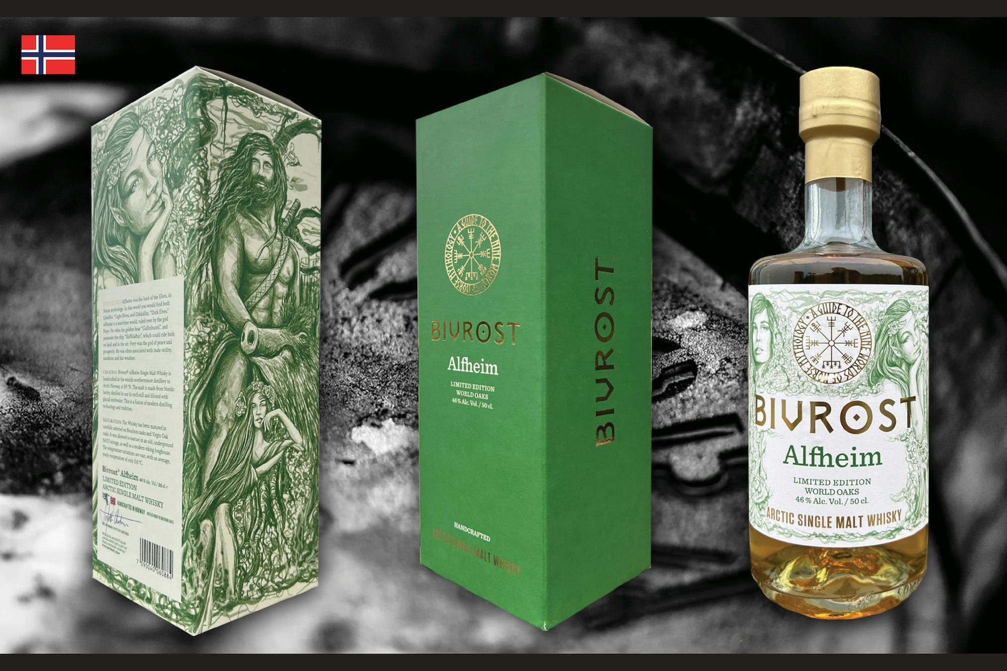シリーズ8番目となる「アルフハイム」は氷のように冷たい大地、ノルウェーの北極圏で氷河の融解水と北極の大麦から作られ、ハイテク蒸留器で蒸留された後、フレンチオーク樽、アメリカンオーク樽、チンカピンオーク樽、コロンビアンオーク樽という選び抜かれた4種類のオーク樽で熟成され、シリーズ中最も力強く深い味わいが特徴とされる。「ワールド·オーク」のタイトルを持つ「アルフハイム」は、その名の通り様々なオークの木の特徴が絶妙に混ざり合ったウッディな風味のシングルモルトで、それぞれの樽由来の特徴が非常に興味深い。