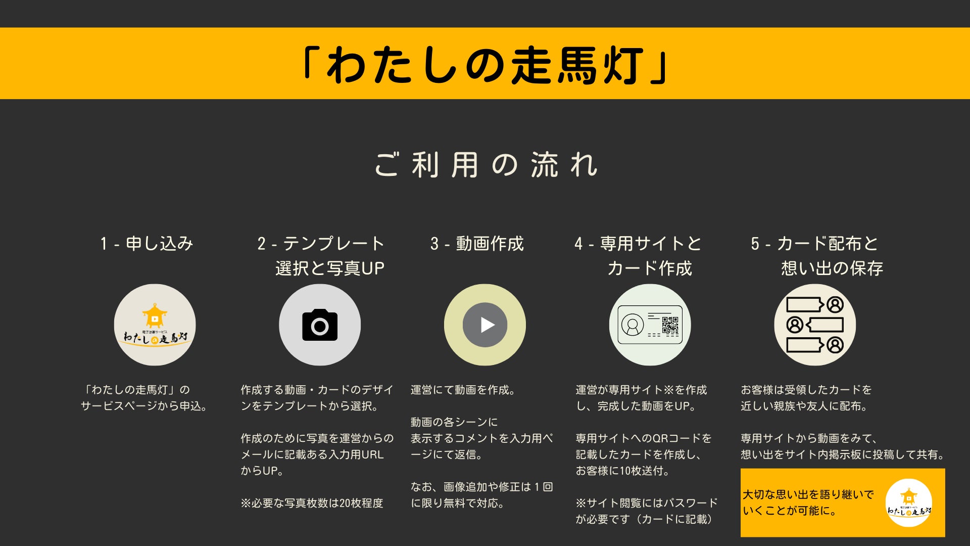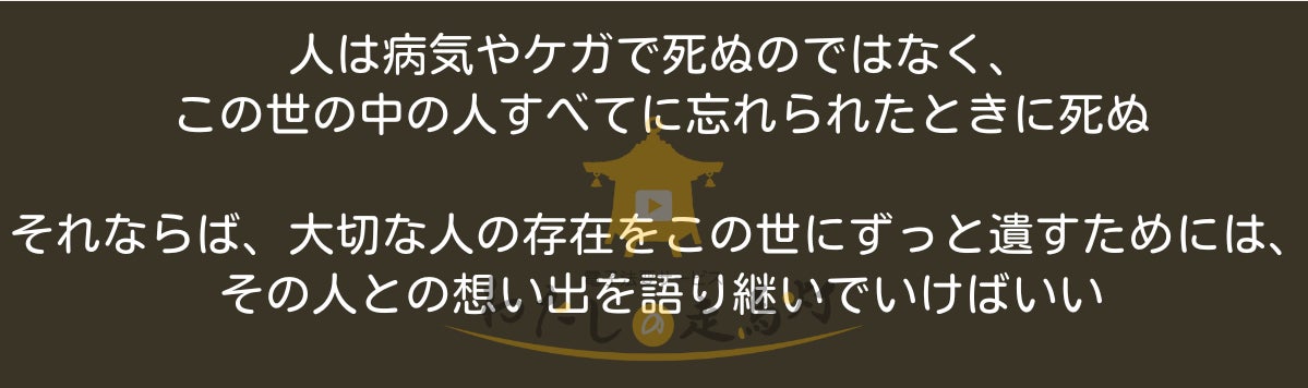 いつか来る大切な人とのお別れ、その時が改めて大切な人を記憶に残す時間とする一助になればと思い、もがきながらどうにか作り上げたのがこの仕組みです。