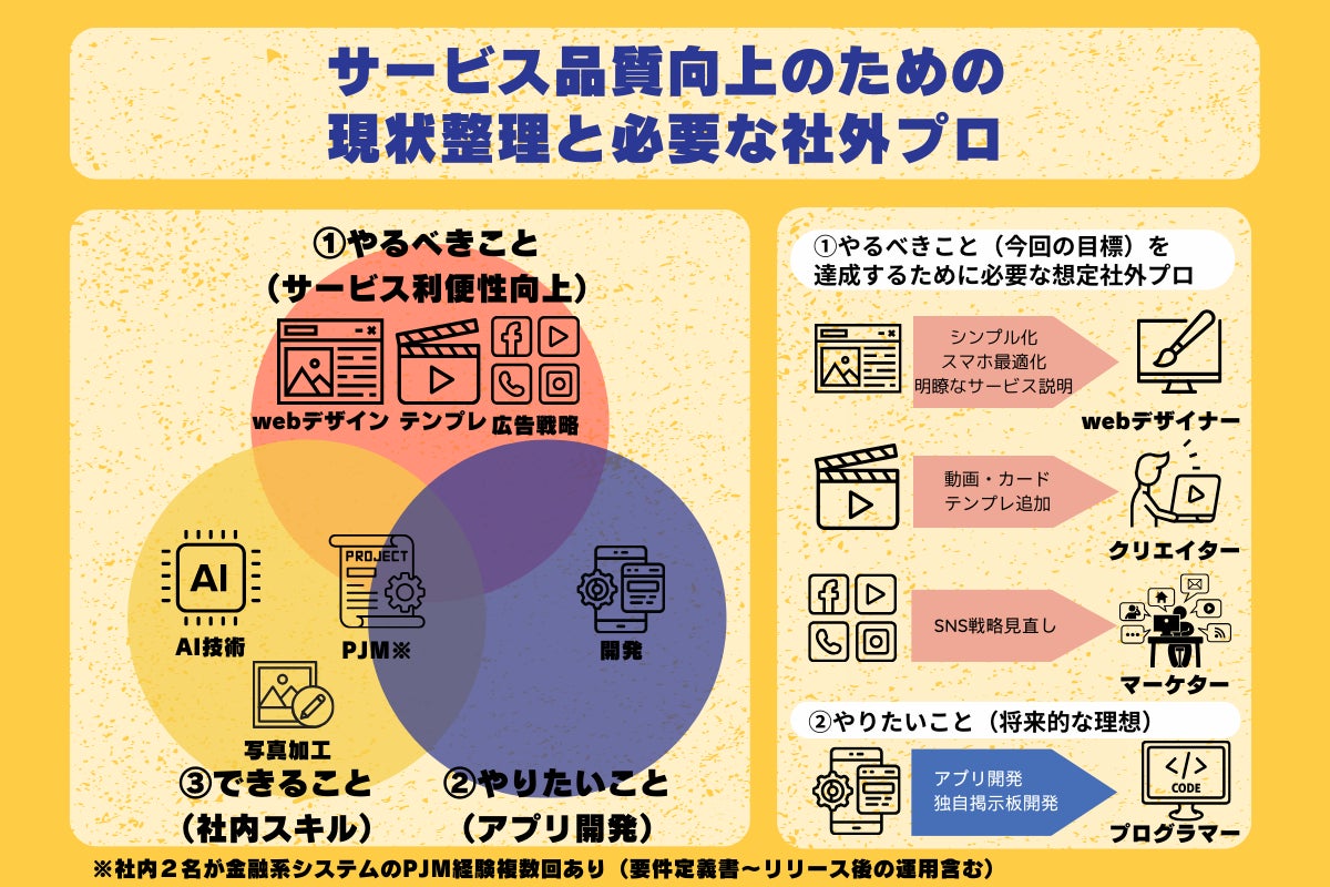 結果として、①②を実施するために必要なスキルが③にないと判断し、スキルを有した社外プロフェッショナル(以下、社外プロ)の方に依頼することで解決を図ることとしました。