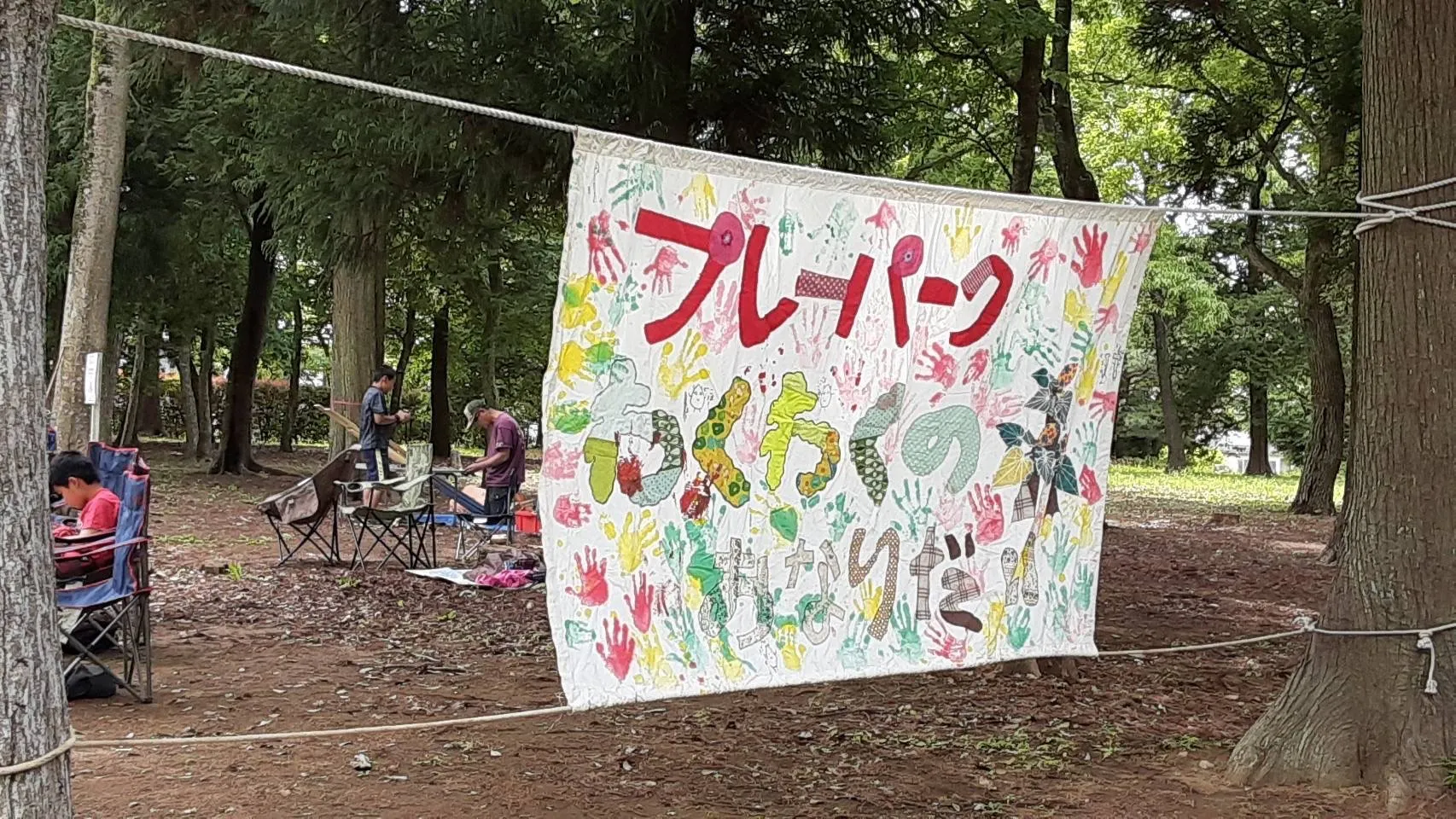 木を薄く削ってる作業中に真ん中で折れちゃったみたい。あいにく木工用ボンドしかなく応急処置しかできず。それでも落ち込んだ様子は見せずに、後から来た友達と合流して笑顔で運動系の遊びにGO!