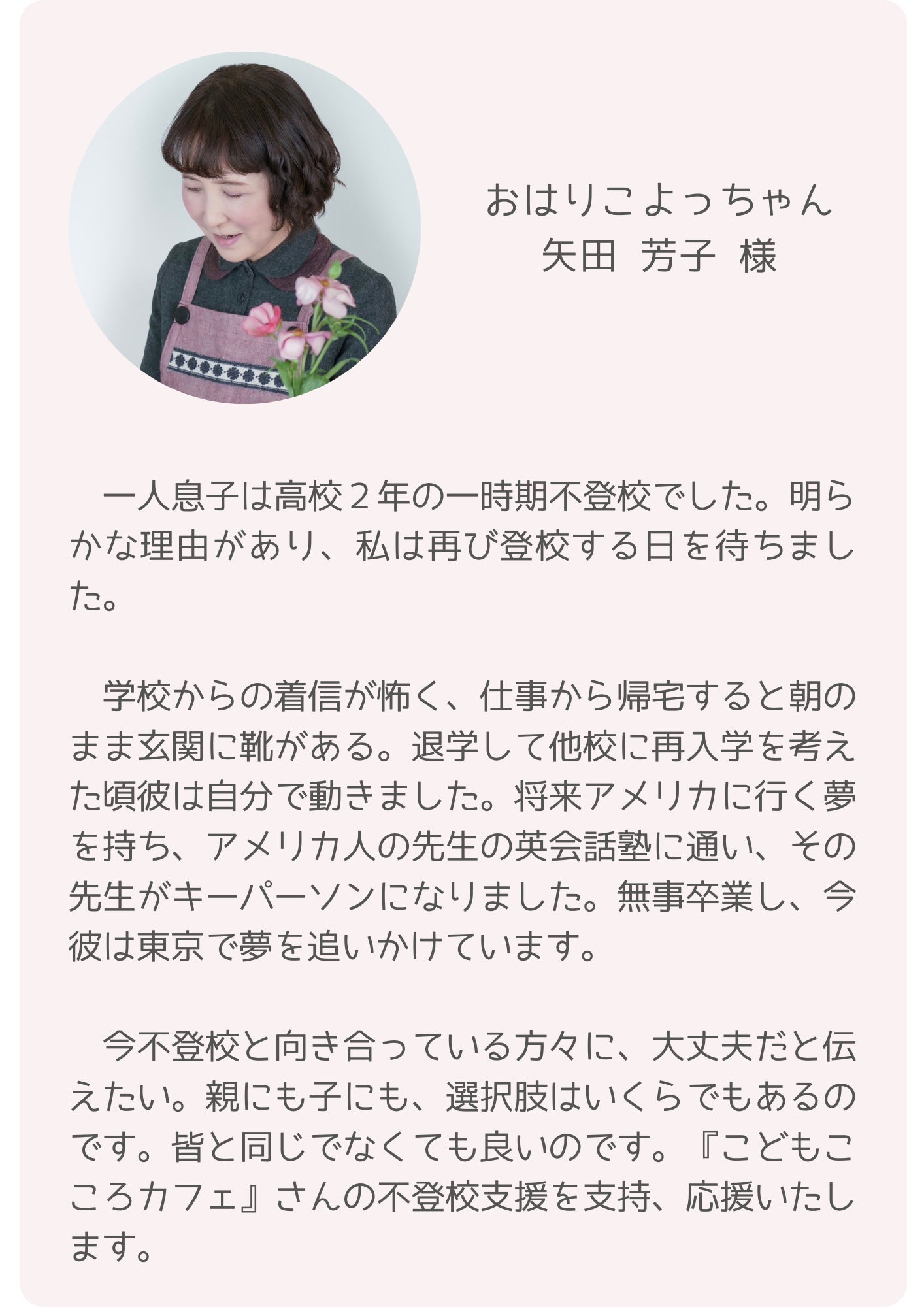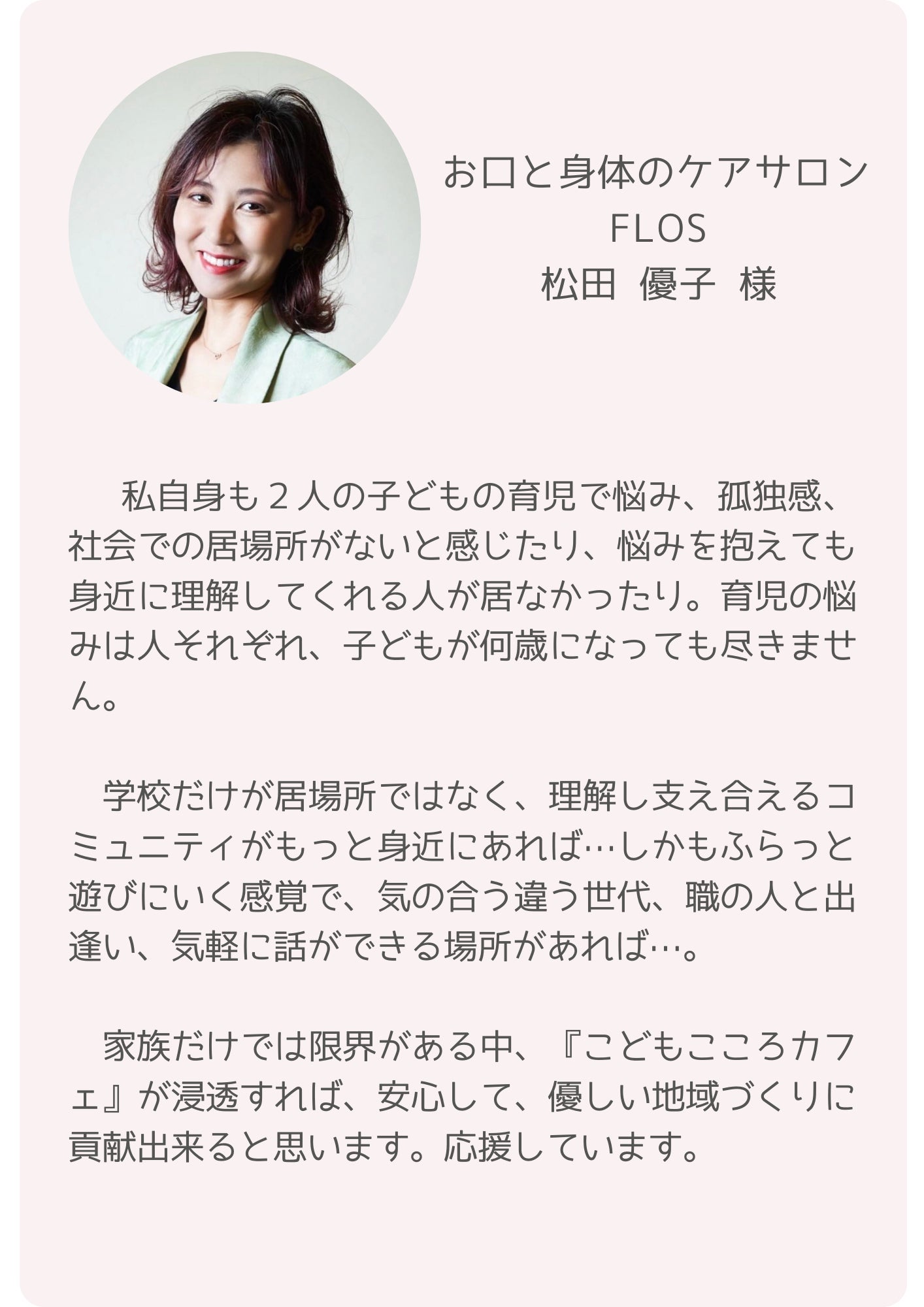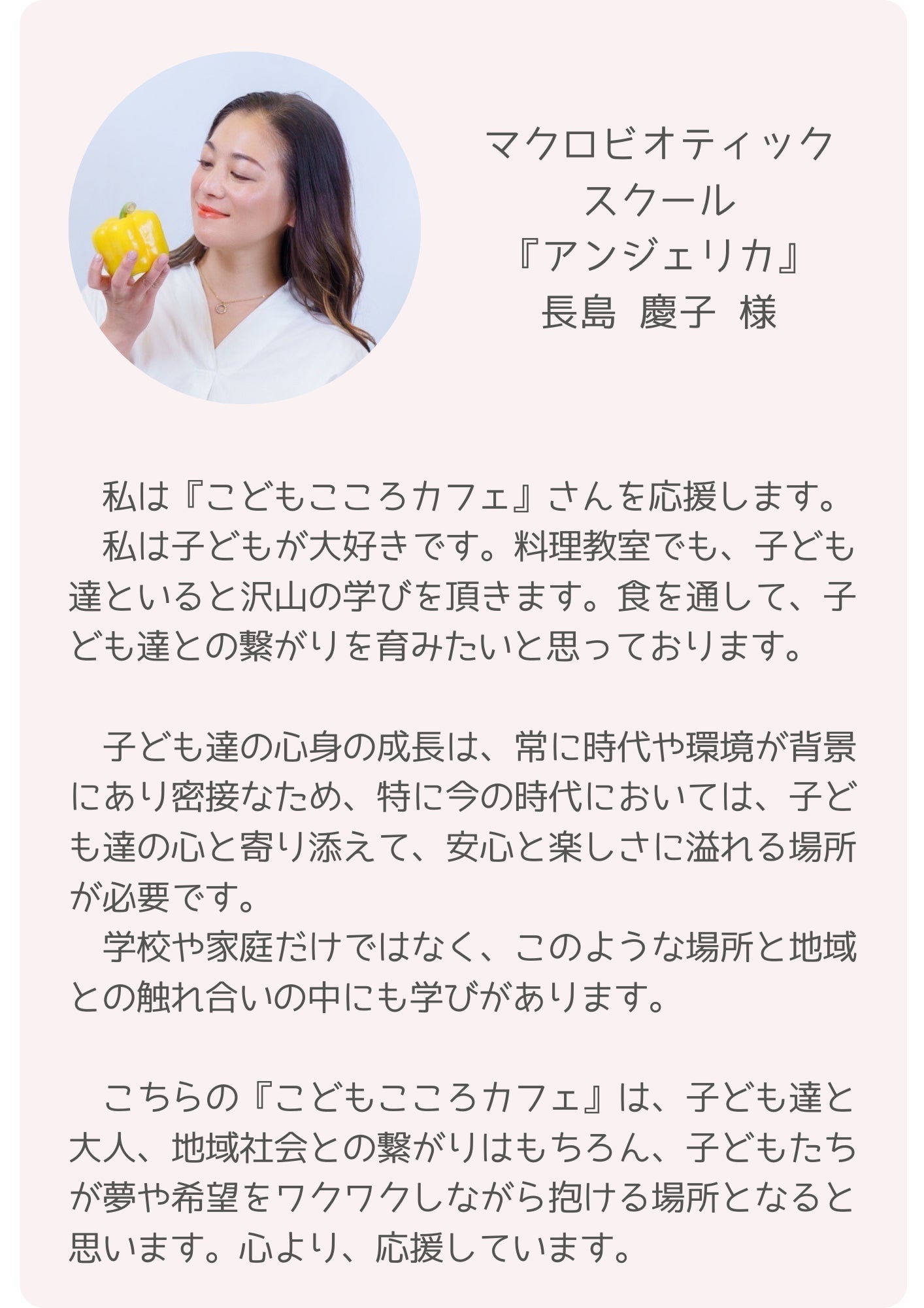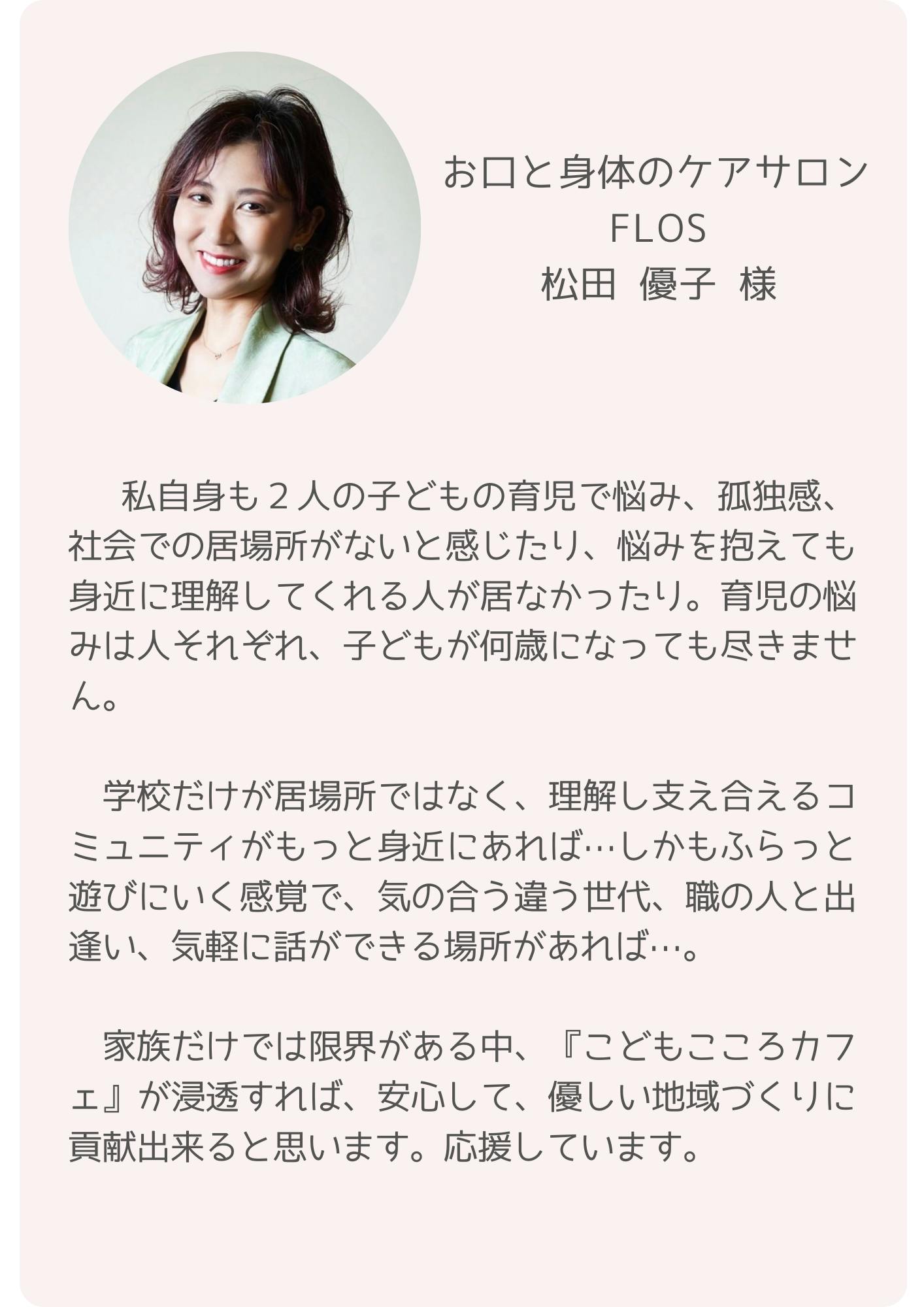「こどもこころカフェ」に興味を持ってくださった方、「こどもこころカフェ」の趣旨に賛同してくださった方、「こどもこころカフェ」に行ってみたいと思ってくださった方、私たちの想いにご賛同くださる皆様よりあたたかいご支援をいただけますよう、どうぞよろしくお願い申し上げます。
