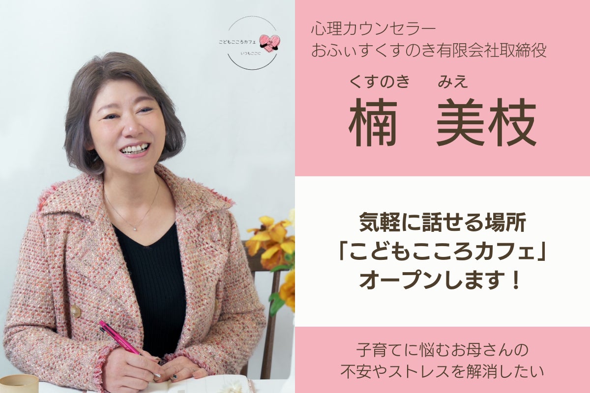 みなさん、はじめまして。心理カウンセラー、おふぃすくすのき有限会社取締役の楠 美枝(くすのき みえ)と申します。子育て支援団体こどもこころカフェの代表も務めています。