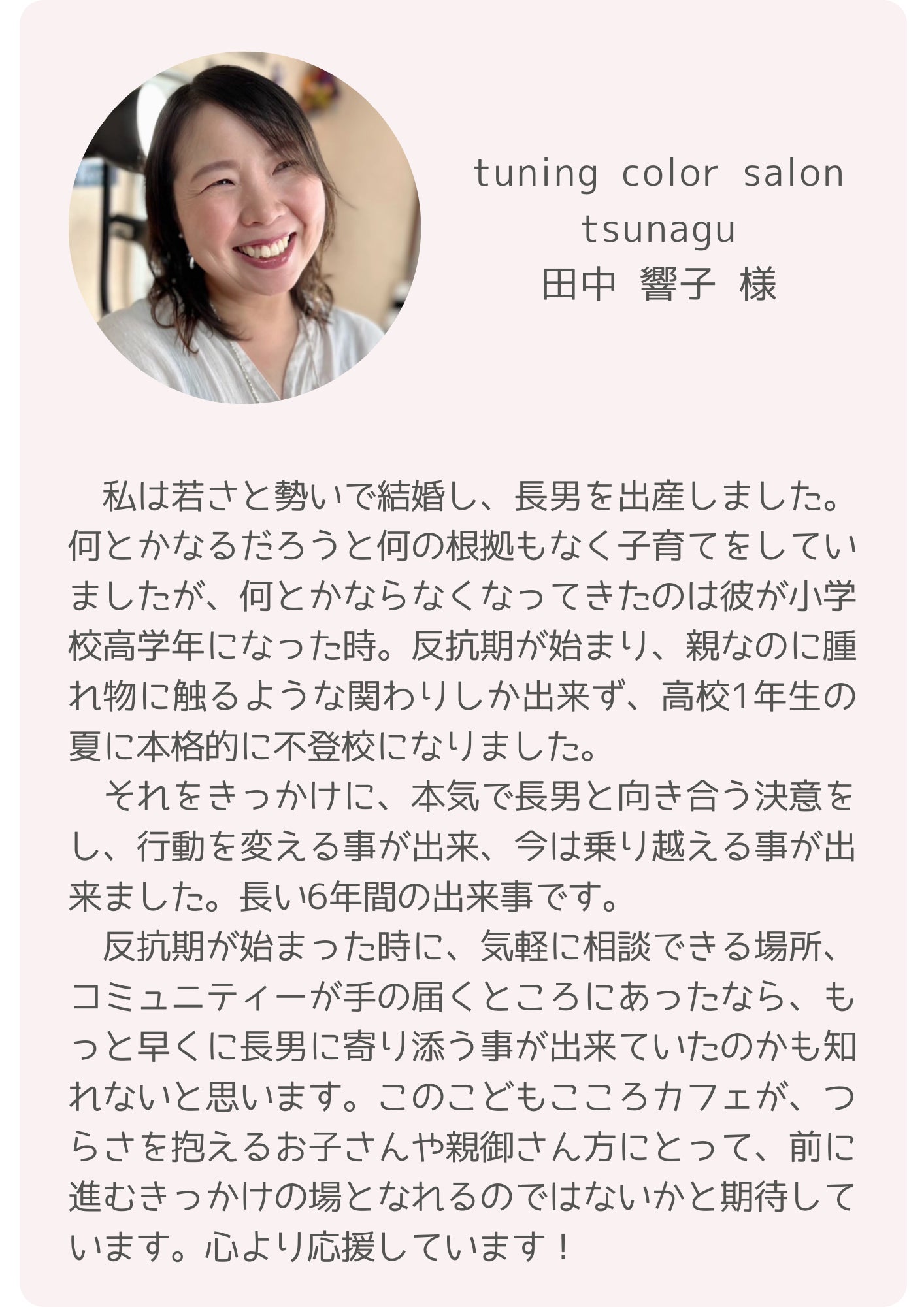 あの頃の私が受けられなかった、あの頃の私に必要だった支援を私の手で作りたい。私と同じように悩んでいる人は今でもたくさんいます。そんな方が一息つける、心をリセットできる場所を、と思って子どもこころカフェを立ち上げました。