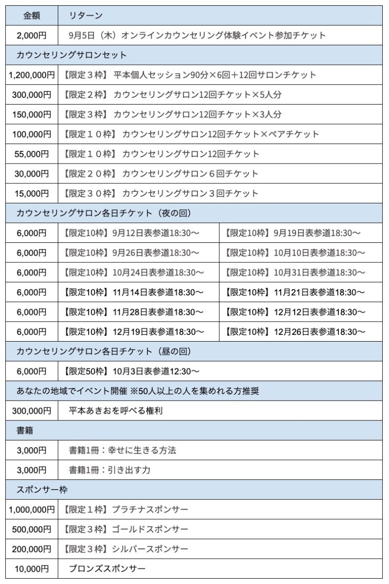 みんなの支援のお陰で、93 %達成しました!!本当にたくさんのシェア、応援、ありがとう!実は、今回のクラファン、『カウンセリングサロン応援』の側面と『チケット販売の窓口』の側面があります。 『応援の方』はたくさんのご支援、予想以上です! 一方、『参加してもらうチケットの方』は、全参加可能人数780名に対して、今現在は、189名と苦戦しています。 カウンセリングサロンの醍醐味は、参加してもらってこそ、と思っているので、ぜひ参加してみてください!! 今回は、クラファンを使ったので、『応援の側面』が大きい印象となりましたが、カウンセリングサロンが初めての人にも、気軽に体験してもらうため、 『チケット代』に関しては、今までのカウンセリングサロンと同価格で、純粋に『チケット代のみ』となります。 9-12月のチケット販売は、こちらのクラファンからだけです。 すでに売り切れている日(9/12など)でも、複数回参加チケットなら、参加できます。 ぜひ複数回参加チケット購入お願いします。(12回分 or 6回分 or 3回分) 自分が来れない日は、人に譲渡OK! みなさんに会えるのを楽しみにしています!!