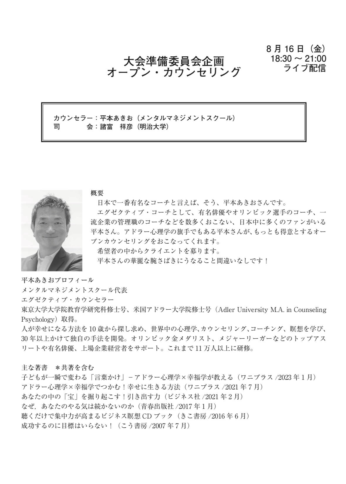 日本カウンセリング学会で平本あきおが登壇!!オープンカウンセリングをさせていただく機会を。あっという間に200席が満席、本当にありがたい。 盟友、明大教授の諸富祥彦さんの推薦のお陰で、アカデミックな場で公開セッションの貴重な機会。 「カウンセリングで、世界は変えられる!!」学会でのオープンカウンセリングはまさにクラファンで全国を周りたいカウンセリングサロンそのもの!!大学や学術団体での成果からも、このカウンセリングの重要性を、もっと世の中に、伝えて行けたらと思います。