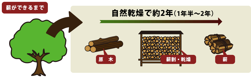 自然乾燥方法での良質な薪は、おおよそ2年もの期間が必要です。