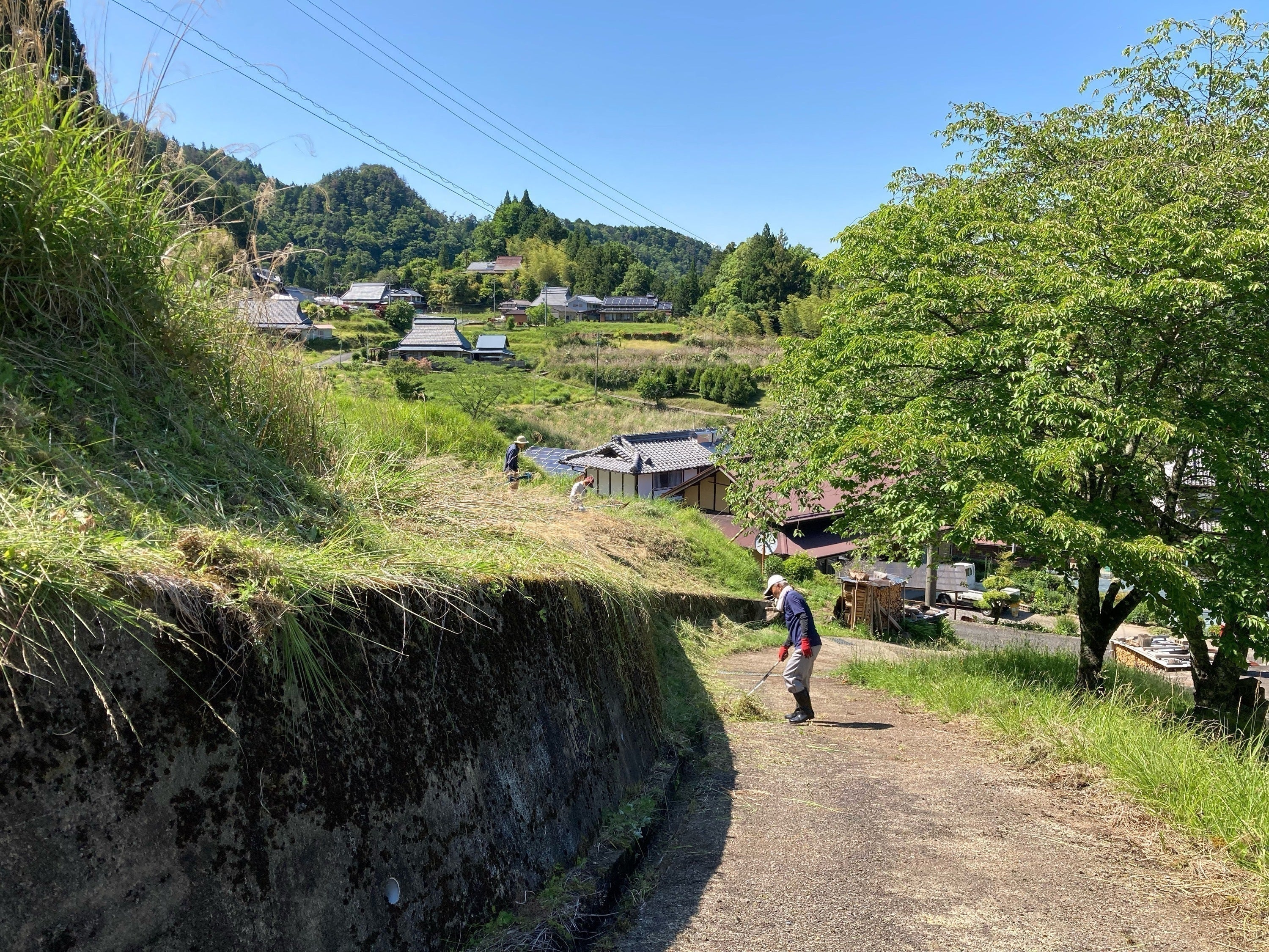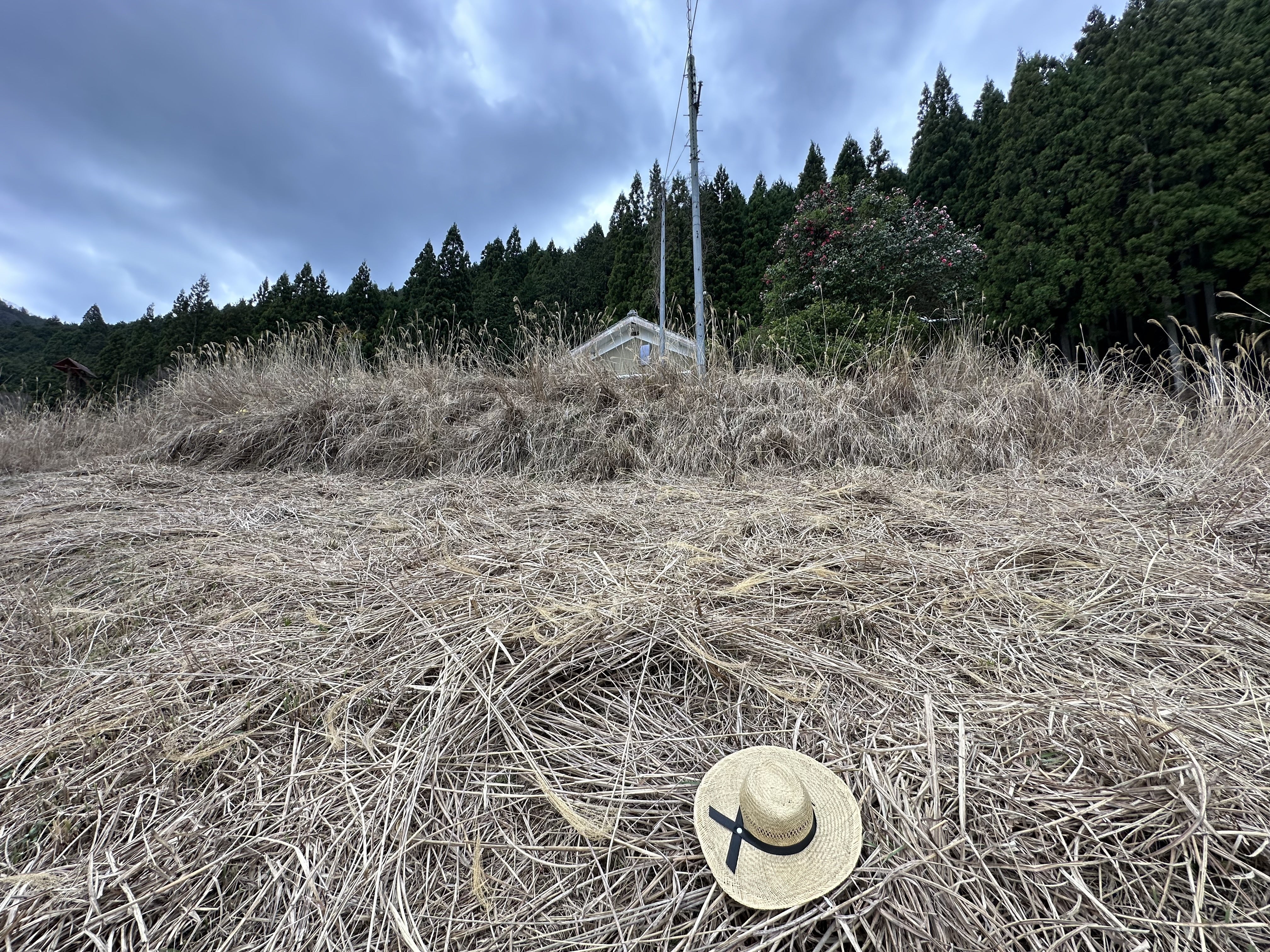 (↓はじめての草刈りを近所の人に教えて貰って硬い根を掘り起こしているところ)