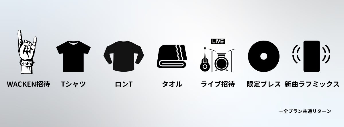 *各リターングッズは当クラウドファンディングのみの限定生産となります(追加コースのTシャツのみ、WACKEN現地でも販売を予定しています)