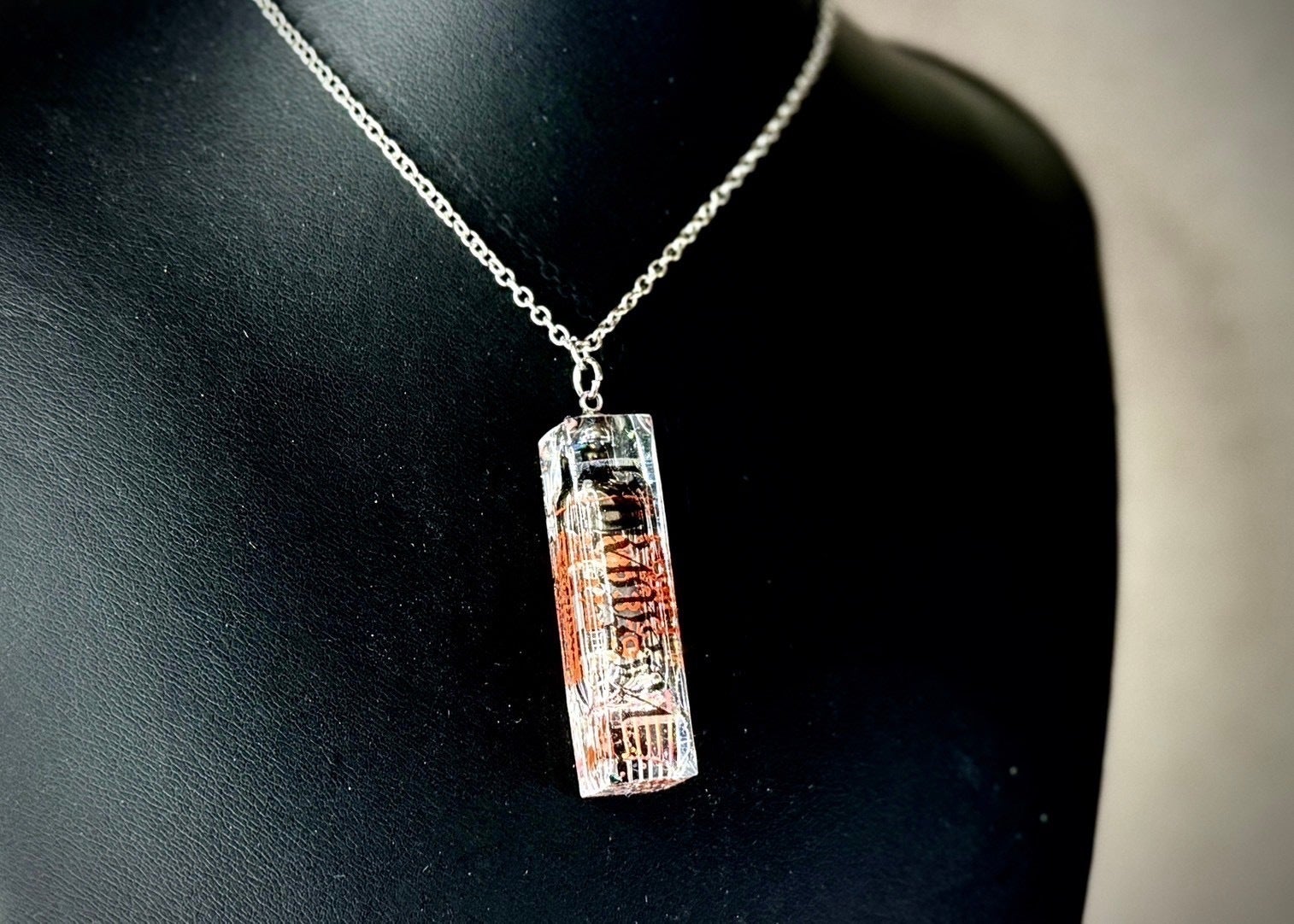 真空管の中でも特に希少なサブミニチュア管を使用し、高品質なレジンで硬化させているため、衝撃を加えても割れる心配のないネックレス。