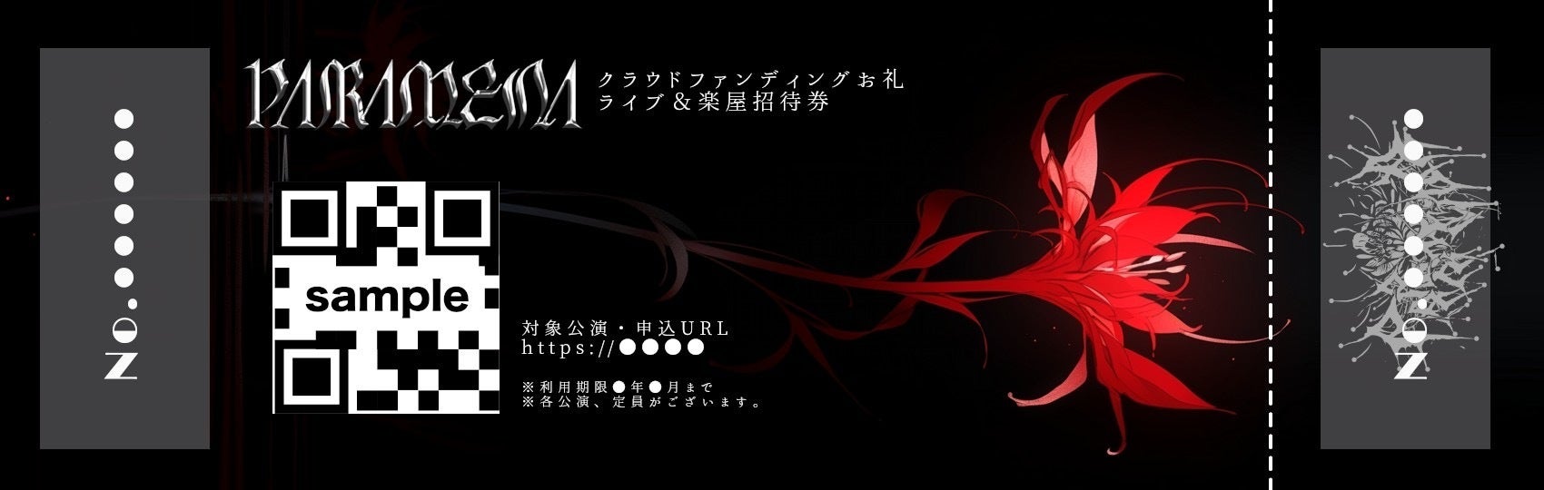 ■ライブ2回&楽屋招待券チケットデザインイメージ(仮)特製デザインを施した記念チケット(紙)を郵送させていただきます。