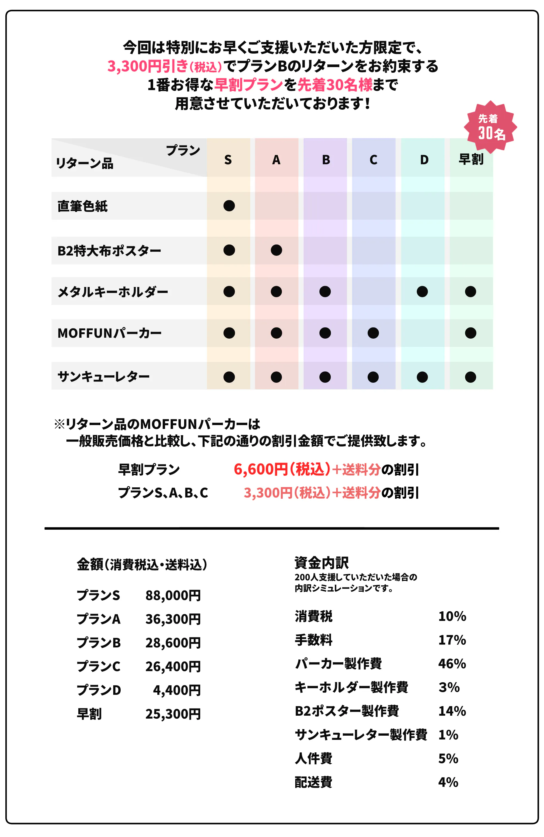 ※本文中に記載させていただいたスケジュールは、あくまでプロジェクト公開時点の予定です。ご支援の性質上、配送遅延のおそれがございます。原則として、配送遅延に伴うご支援のキャンセルはできませんが、リターン配送予定月から8ヶ月を超えた場合には、希望者に限りキャンセルにて対応させていただきます。