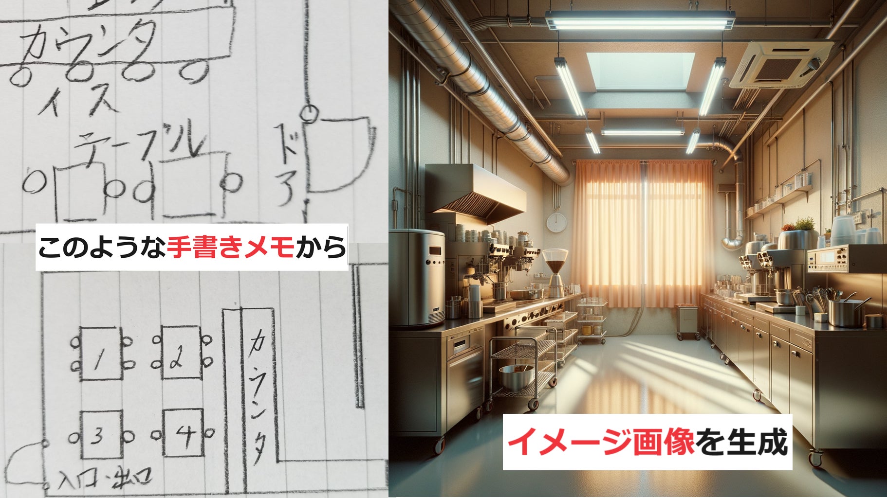 この技術を活用して、手書きのデッサンやメモから飲食店の新規開業やリフォーム時に役立つレイアウトイメージ生成アプリの完成と普及を目指しています。このアプリがあれば、開業またはリフォームを検討しているお客さまはより魅力的で効果的な店舗デザインを簡単に計画でき、店舗のイメージを容易にイメージできて開業・リフォームの準備もスムーズに進みます。何と言っても、施工業者さまとイメージを共有できる点が大きいと思います。