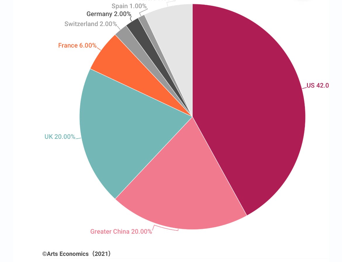 世界美術品市場を分析するレポートによると、2020年の世界の市場規模は5.2兆円。トップ3はアメリカの42%、中華圏の20%、イギリスの20%となっています。