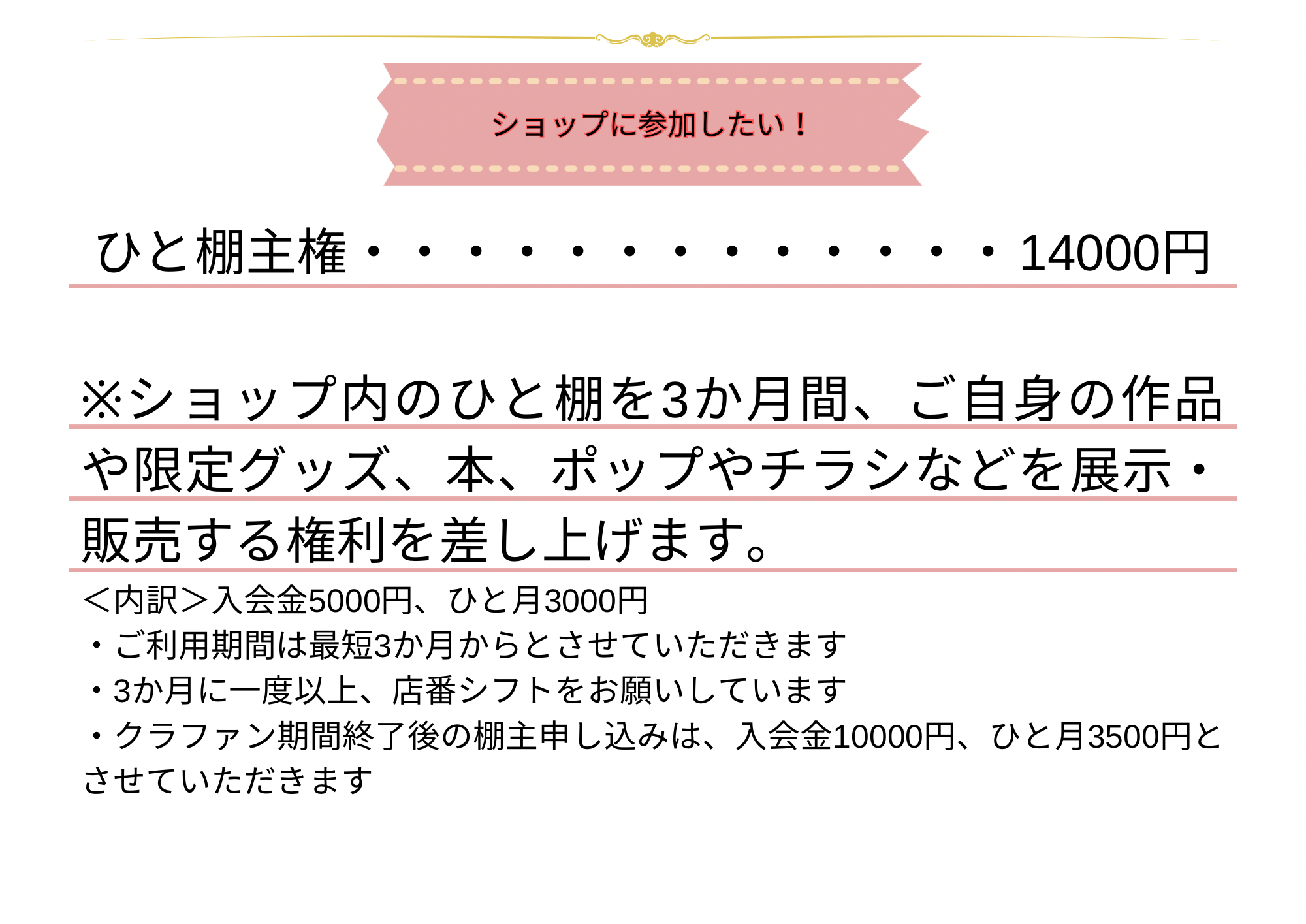 そこで、渋谷ヒカリエに誕生した渋谷◯◯書店や、学芸大学にあるシェア型書店NoDoを参考に、カラーボックス1つをひと棚としてお貸しし、棚主=店主となって、自分の棚に屋号をつけ、自分のアートやグッズを並べて販売するシェア型アートショップを考えました。