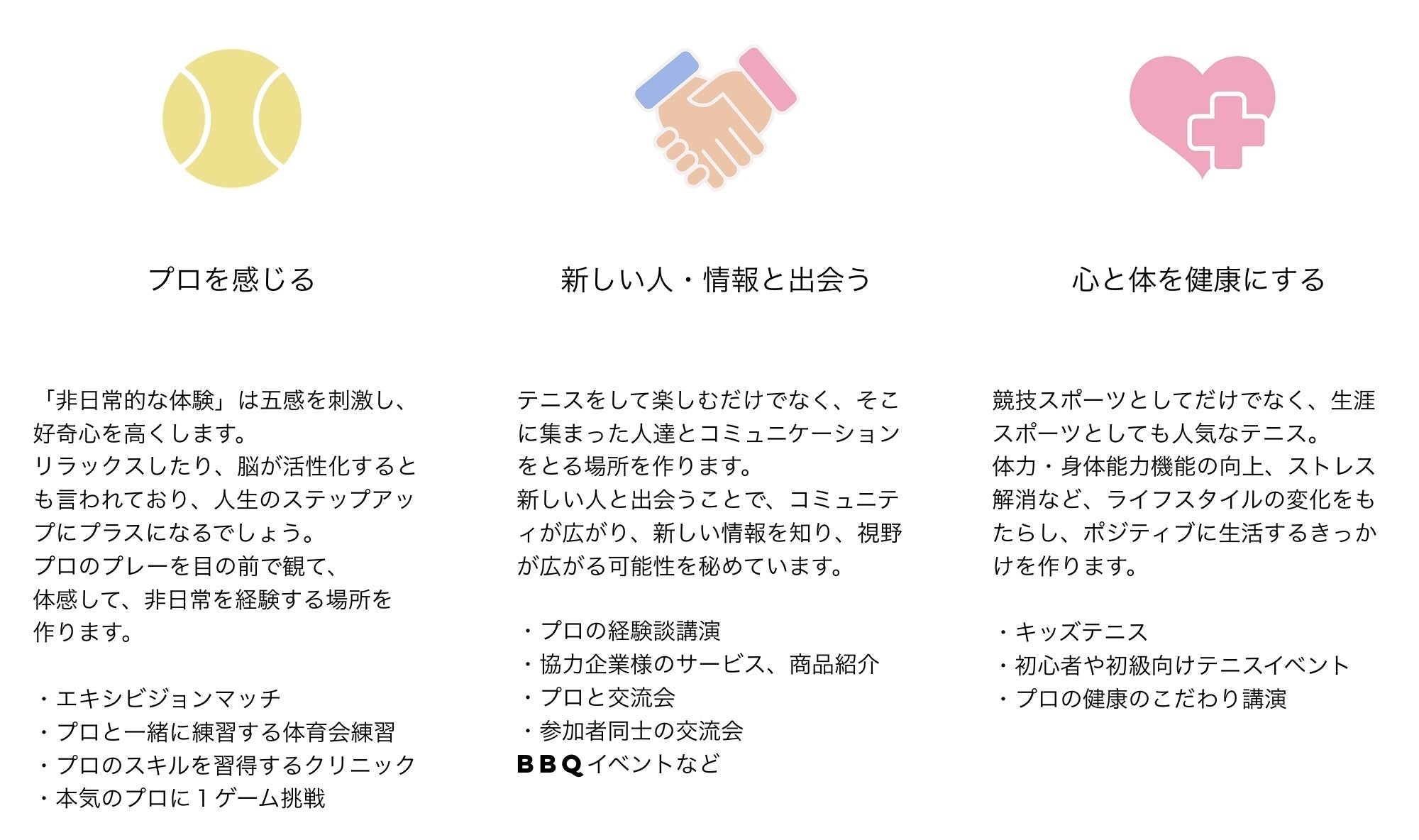 スポーツとしてではなく、生涯スポーツとしてもテニスは人気。どんなことをやるにしても身体は資本。また、体だけではなく、心も健康であることも重要。テニスを通して健康も維持することができる。(初心者向けや親子イベント、栄養指導)