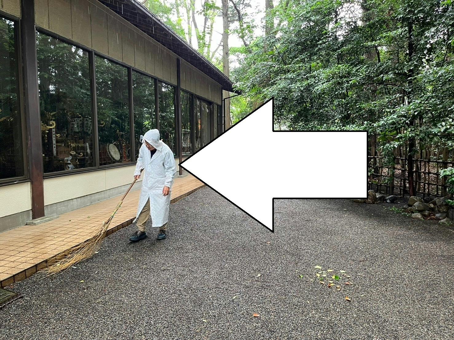 お世話になります。寺社小町の共同設立者・草野俊哉です。大宮八幡宮(東京都杉並区)で、清掃活動してきました。矢印の先・合羽を着ているのが僕です。境内の落ち葉掃きを担当したのですが、雨に打たれた落ち葉は簡単に動いてくれません。落ち葉専用の竹箒で掃くのですが、掃いても掃いても、元の場所から動いてくれません。なんなら、手で一枚ずつ拾った方が早いくらいです。しかも大宮八幡宮の境内は都内で3番目に広いそうで・・・。2時間ほど頑張りまして、それなりのレベルまでキレイにしてきました。そんな今日この頃です。ぜひともサポートのほど、よろしくお願いします。