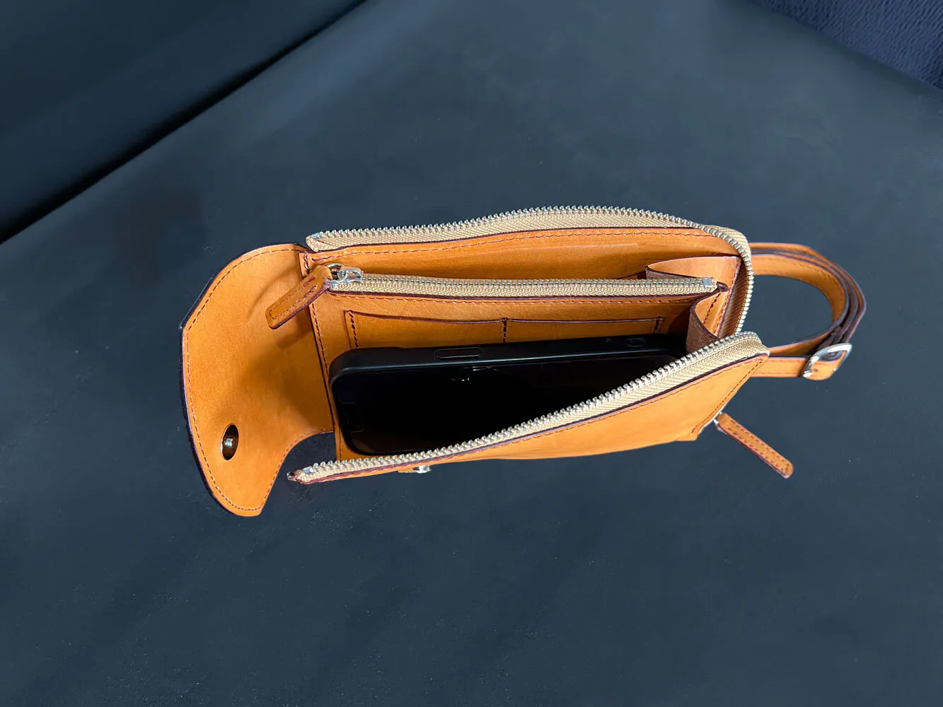 ファスナーを開けると片側にはスマートフォンを、そしてもう一方には紙幣をすっきりと収納することができます。