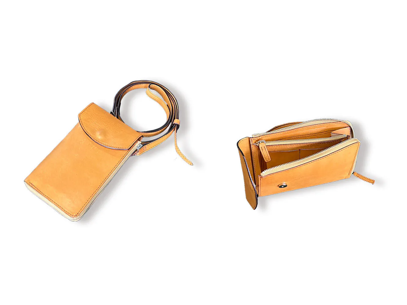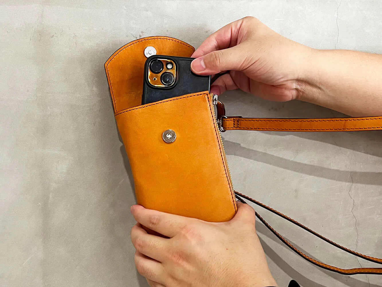 国産牛革を使用、使うほどにあなただけの質感と風合いへと育っていく、スマホウォレットショルダーです。