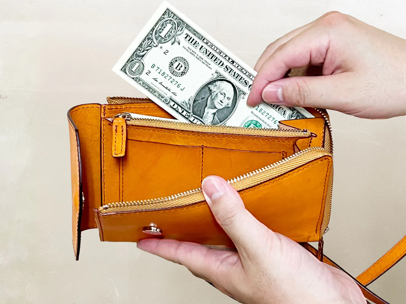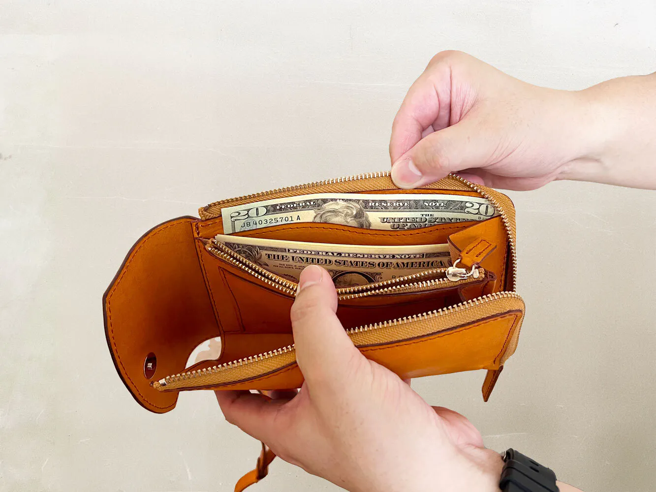 ファスナーを開けると、お札をスムーズに取り出せる仕組みで、非常に便利にご使用いただけます。