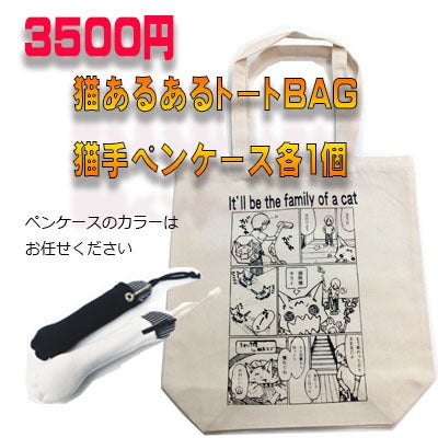 3500円 ■ネコとの幸せを願う「家族になろう」猫あるあるトートバッグ1個+当店オリジナル 猫手型ペンケース1個